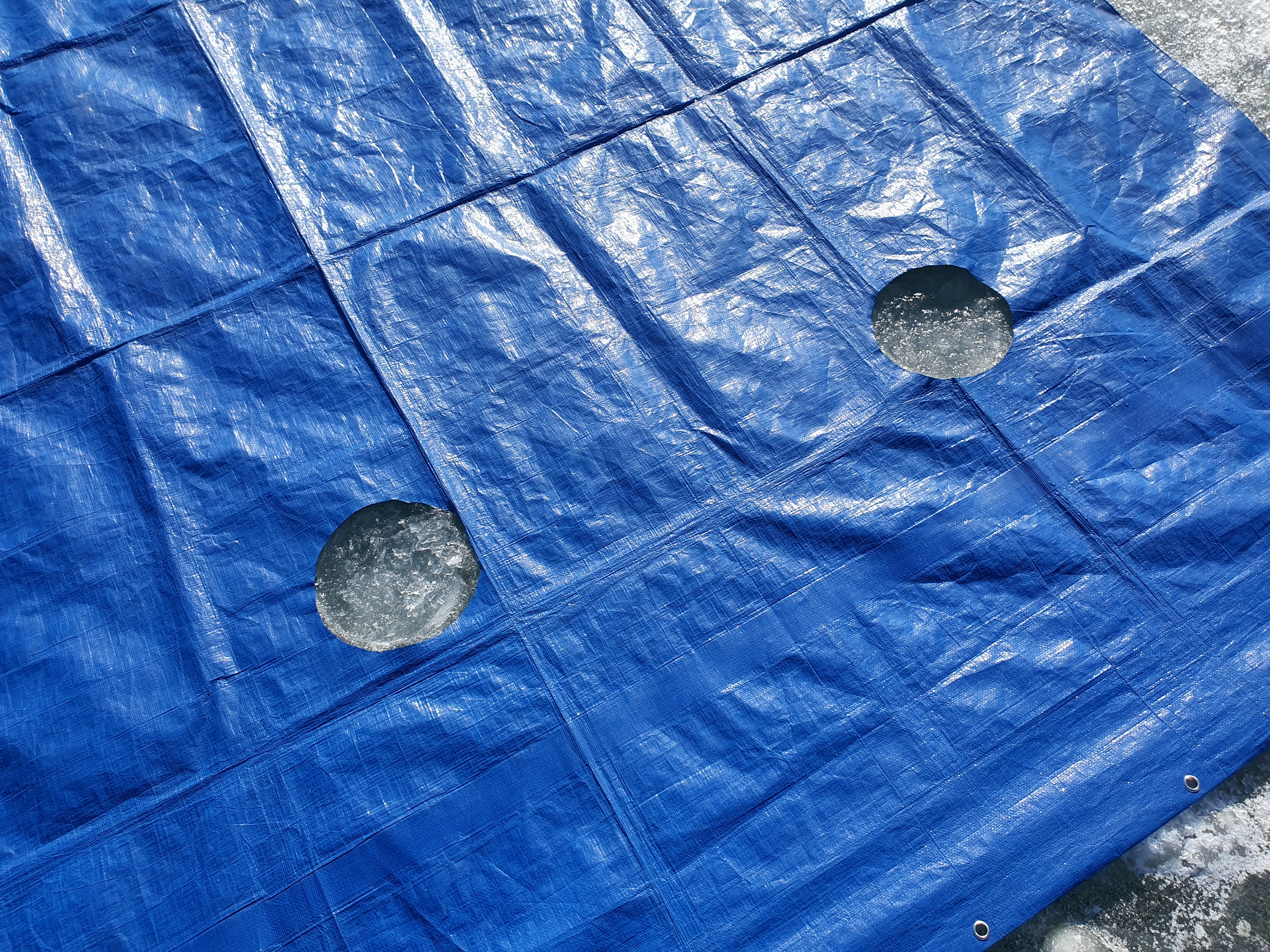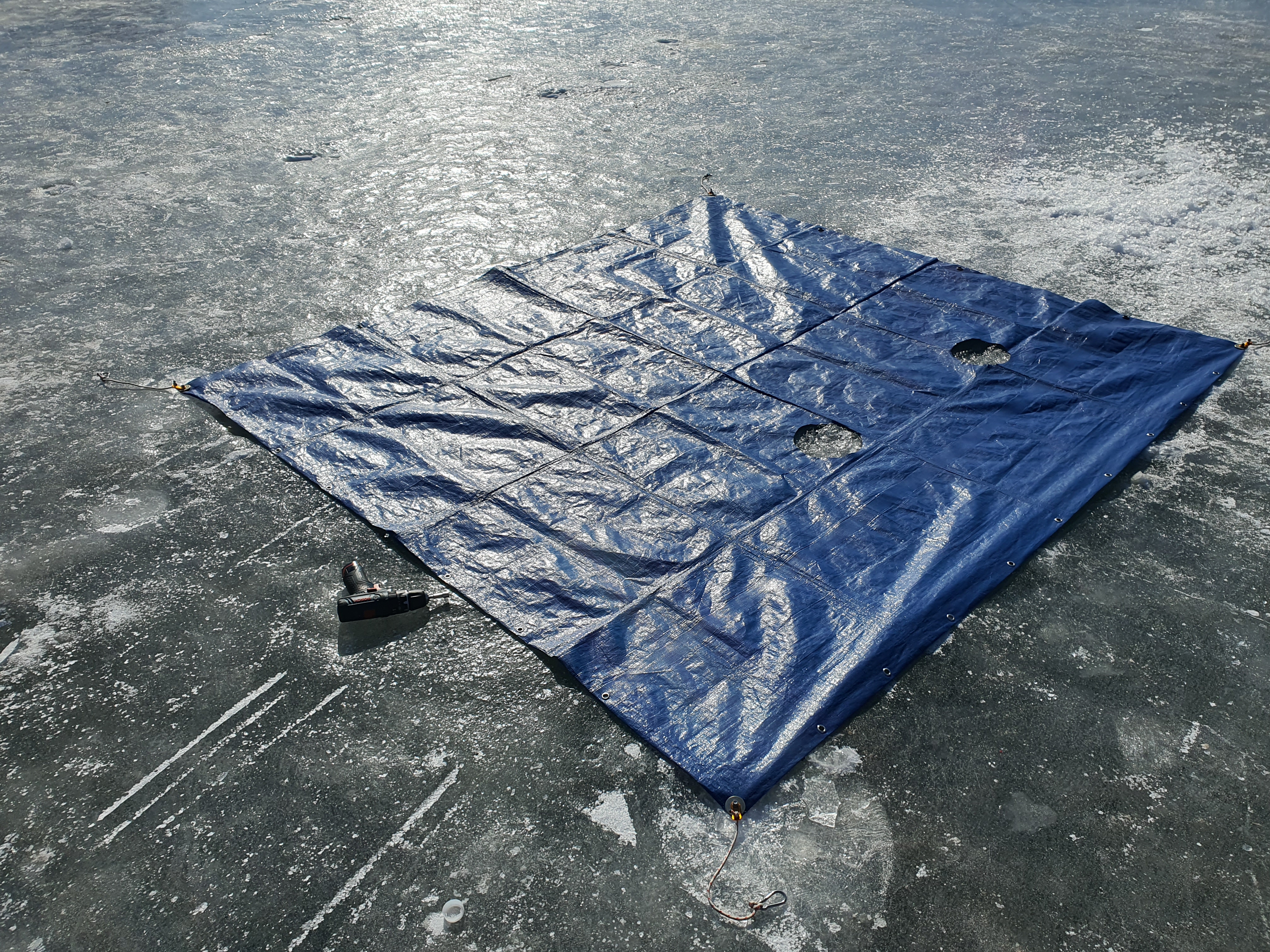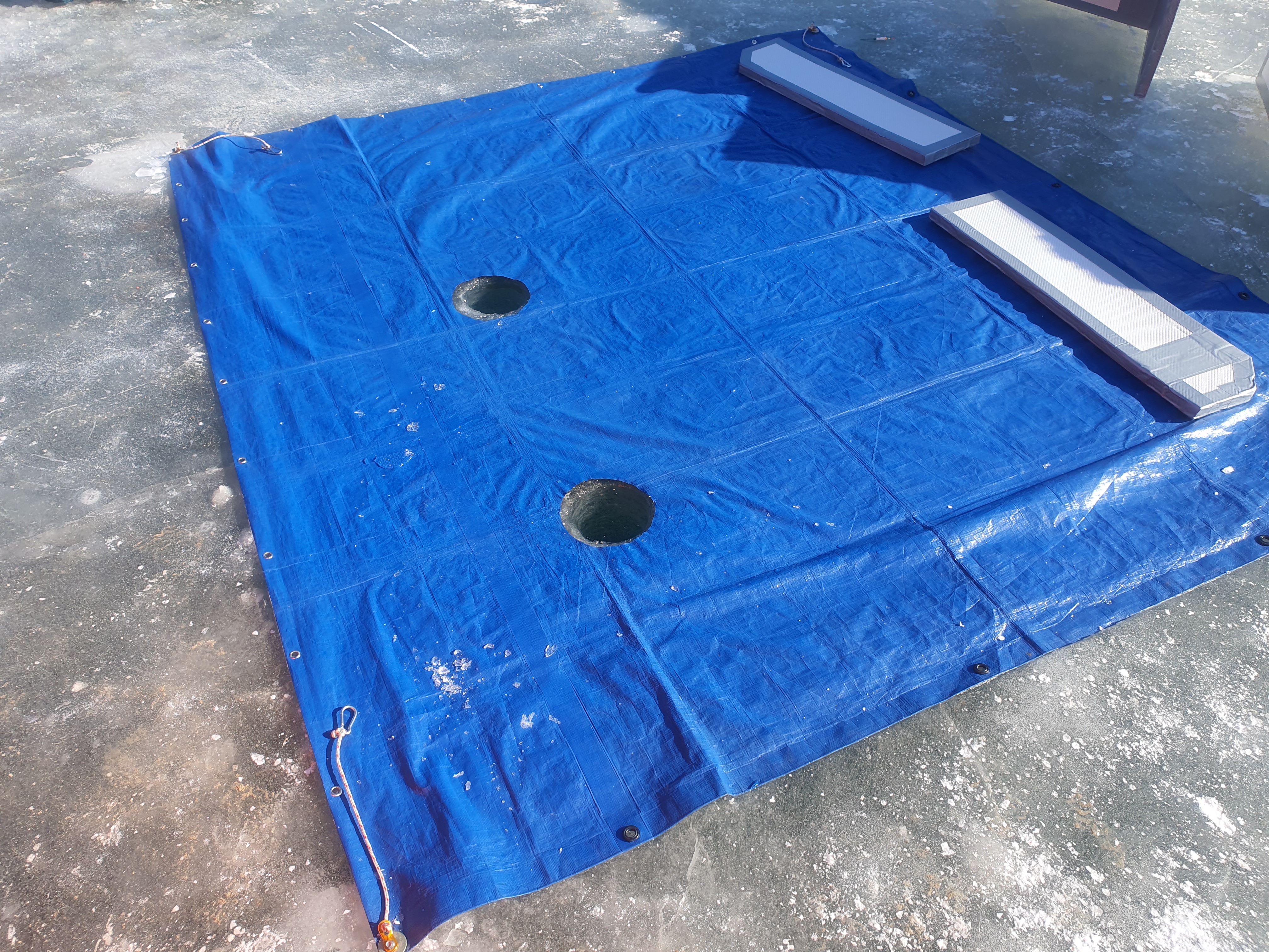 빙판 위 구멍과 방수포 구멍 위치가 맞는지 확인 후, 방수포를 고정시켜 줍니다.