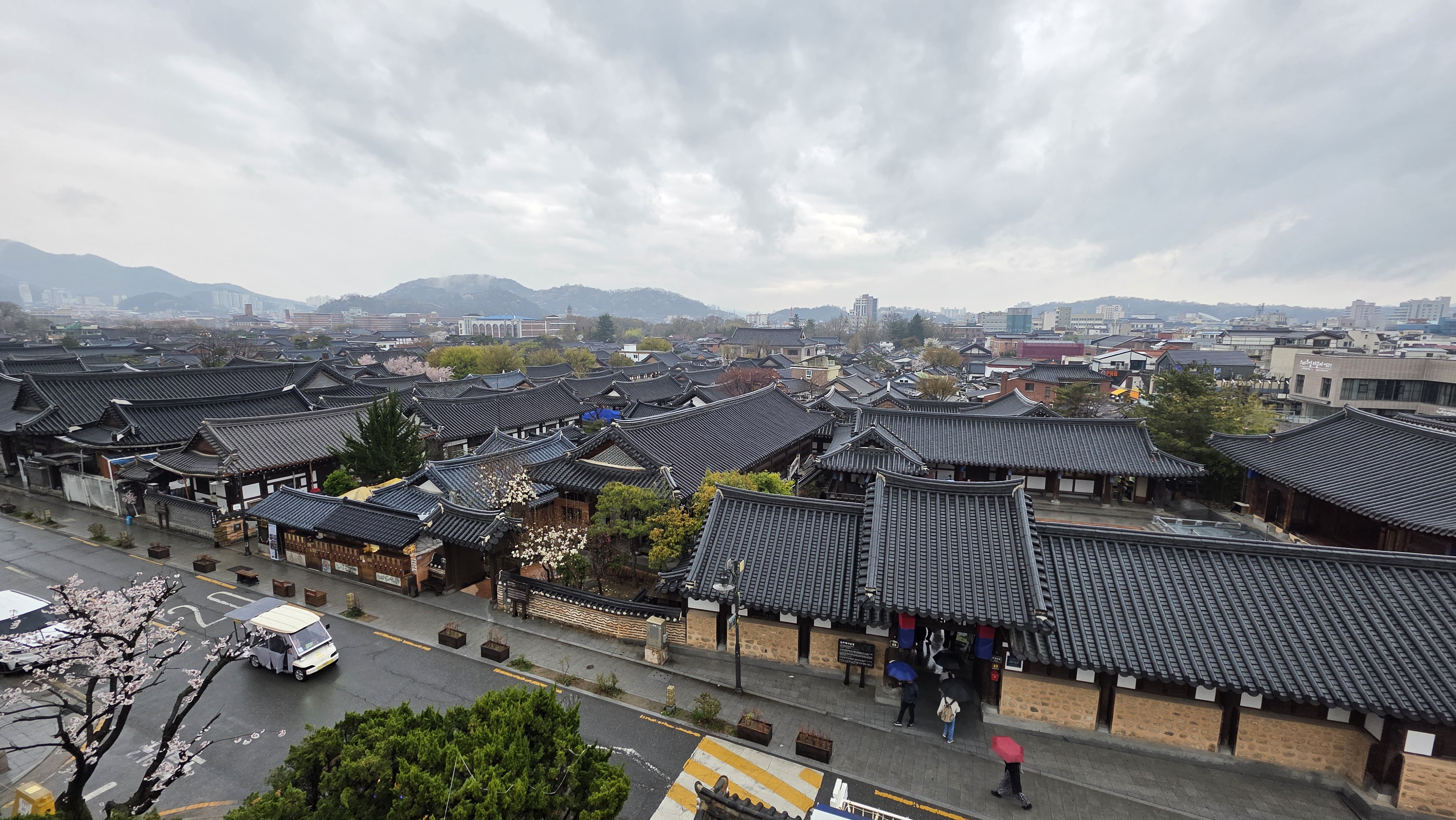 식사를 마치고 계속되는 비로 인해 한옥마을 초입에 있는 전망대 카페에서 커피를 마시며 한옥마을 전경을 즐깁니다.