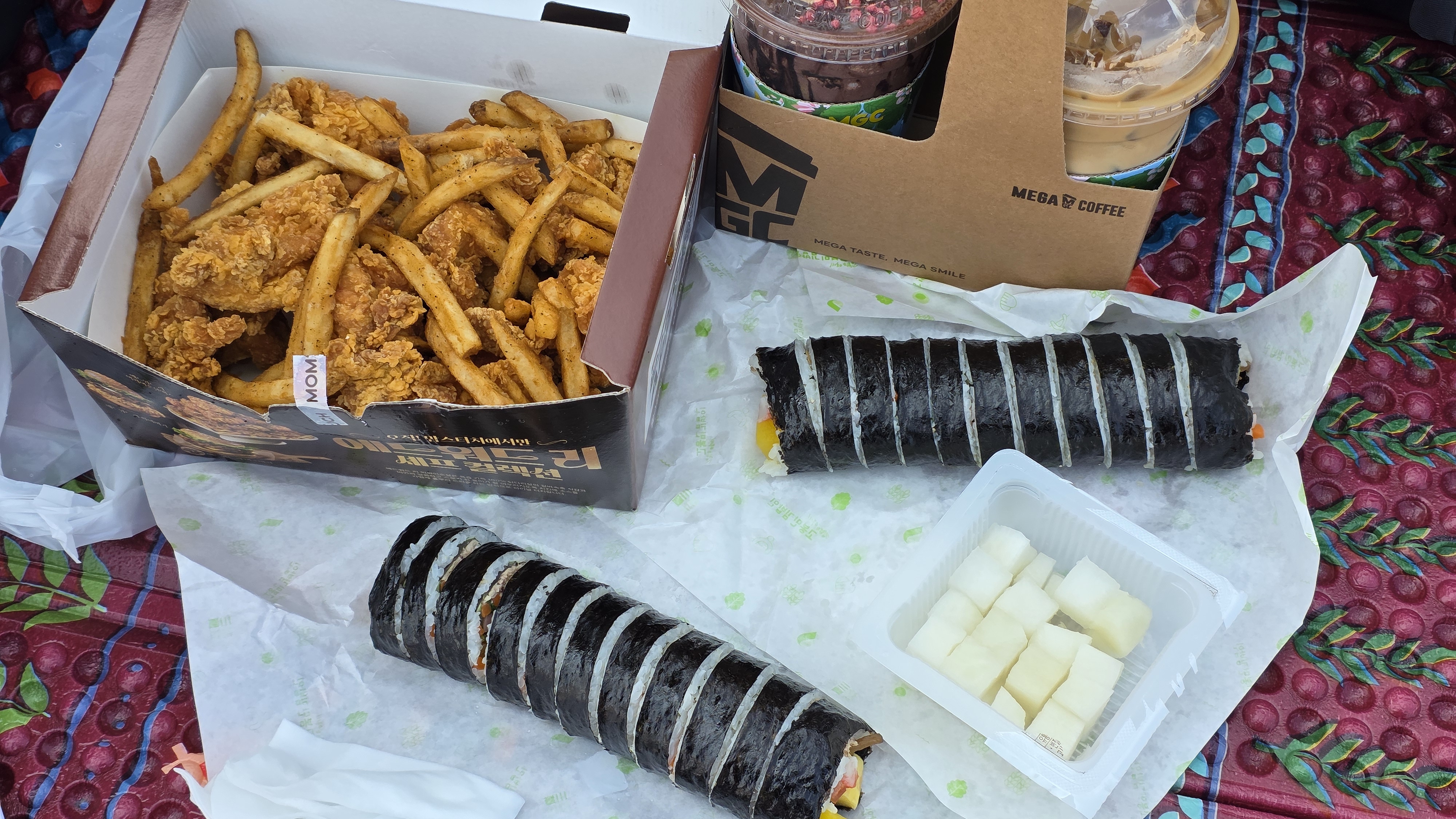 점심식사를 위해 치킨과 김밥과 음료를 사 왔네요.