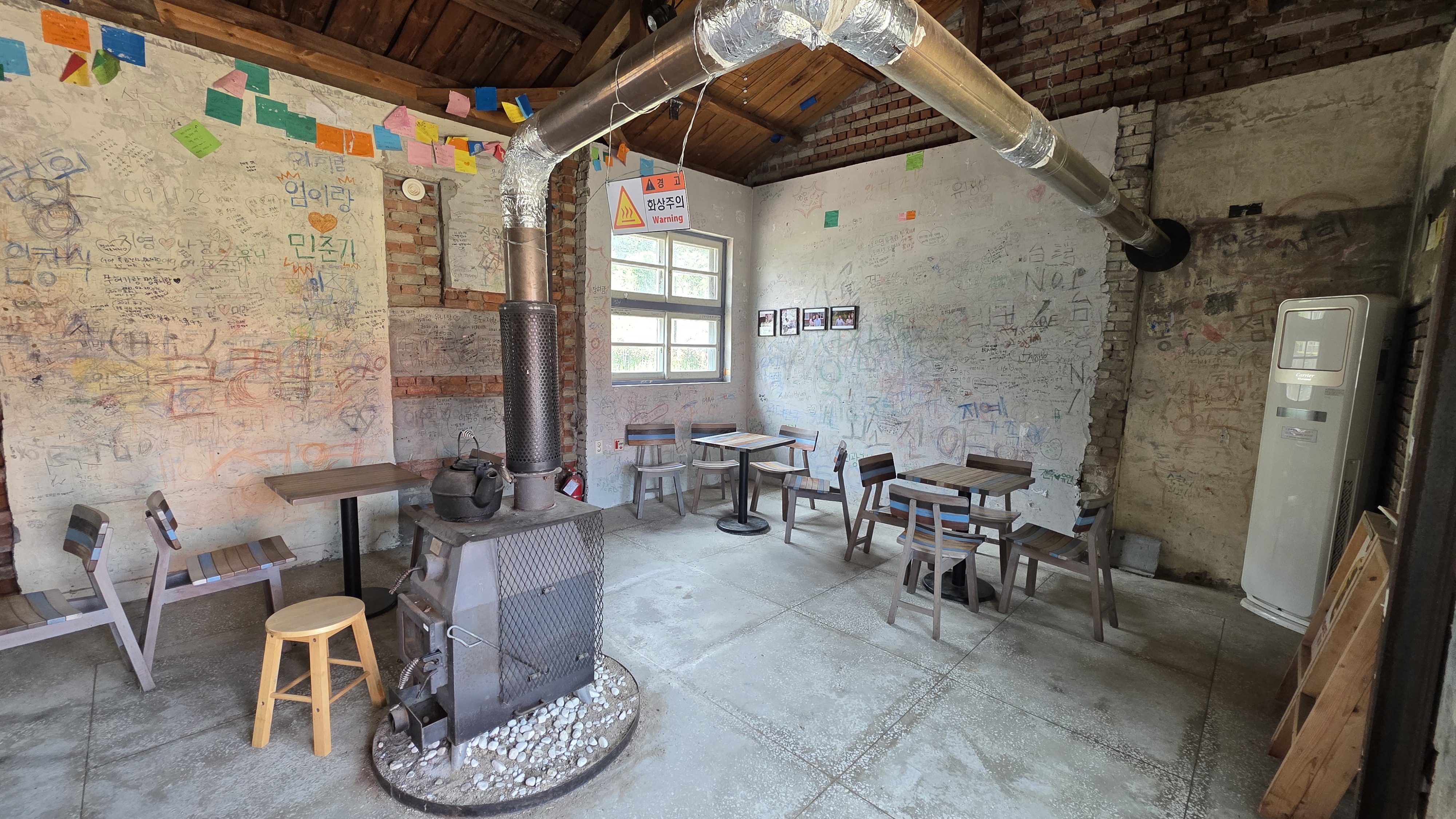 역사 내에 화목난로에 테이블이 있어 잠시 쉴 수도 있고