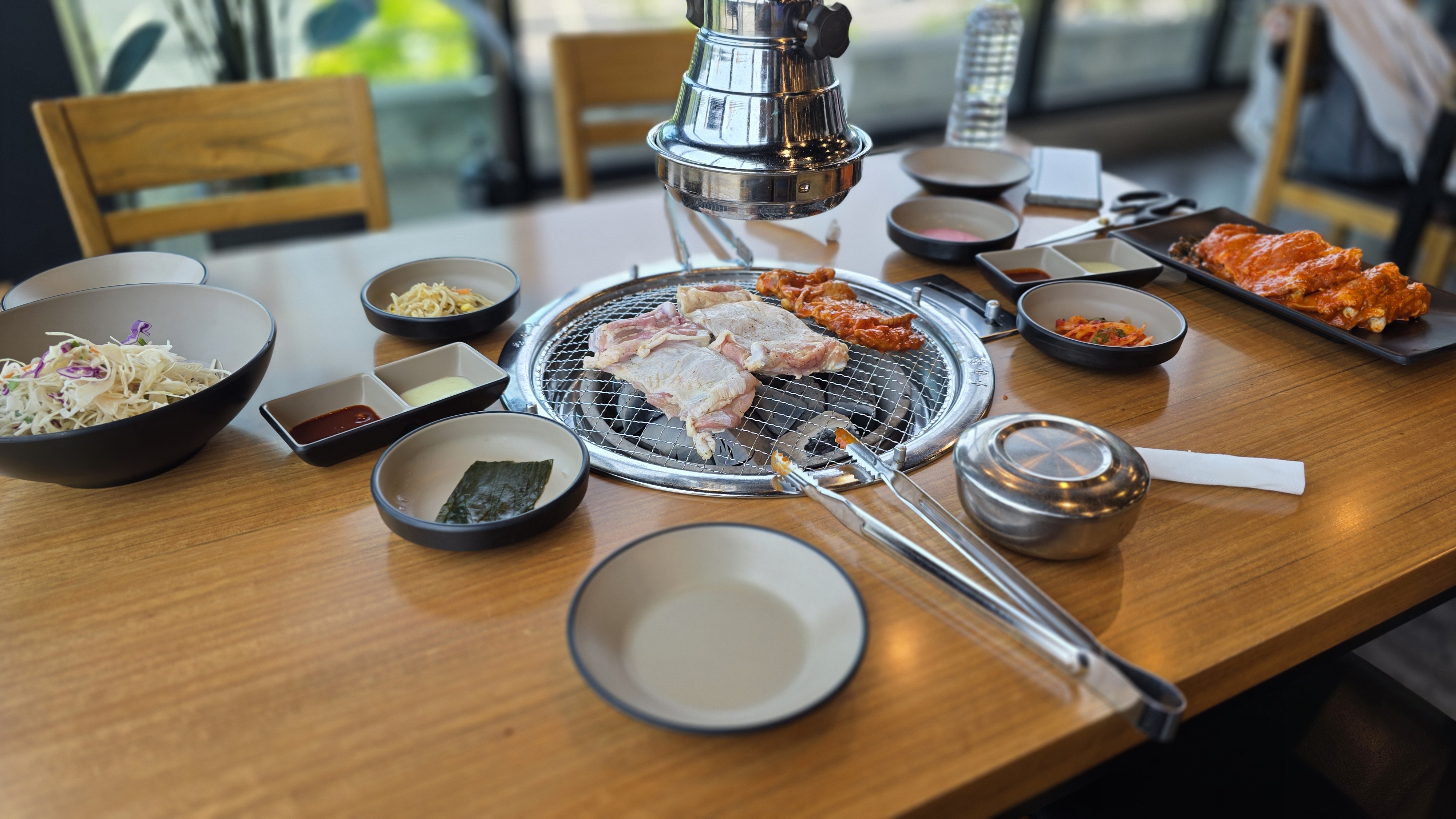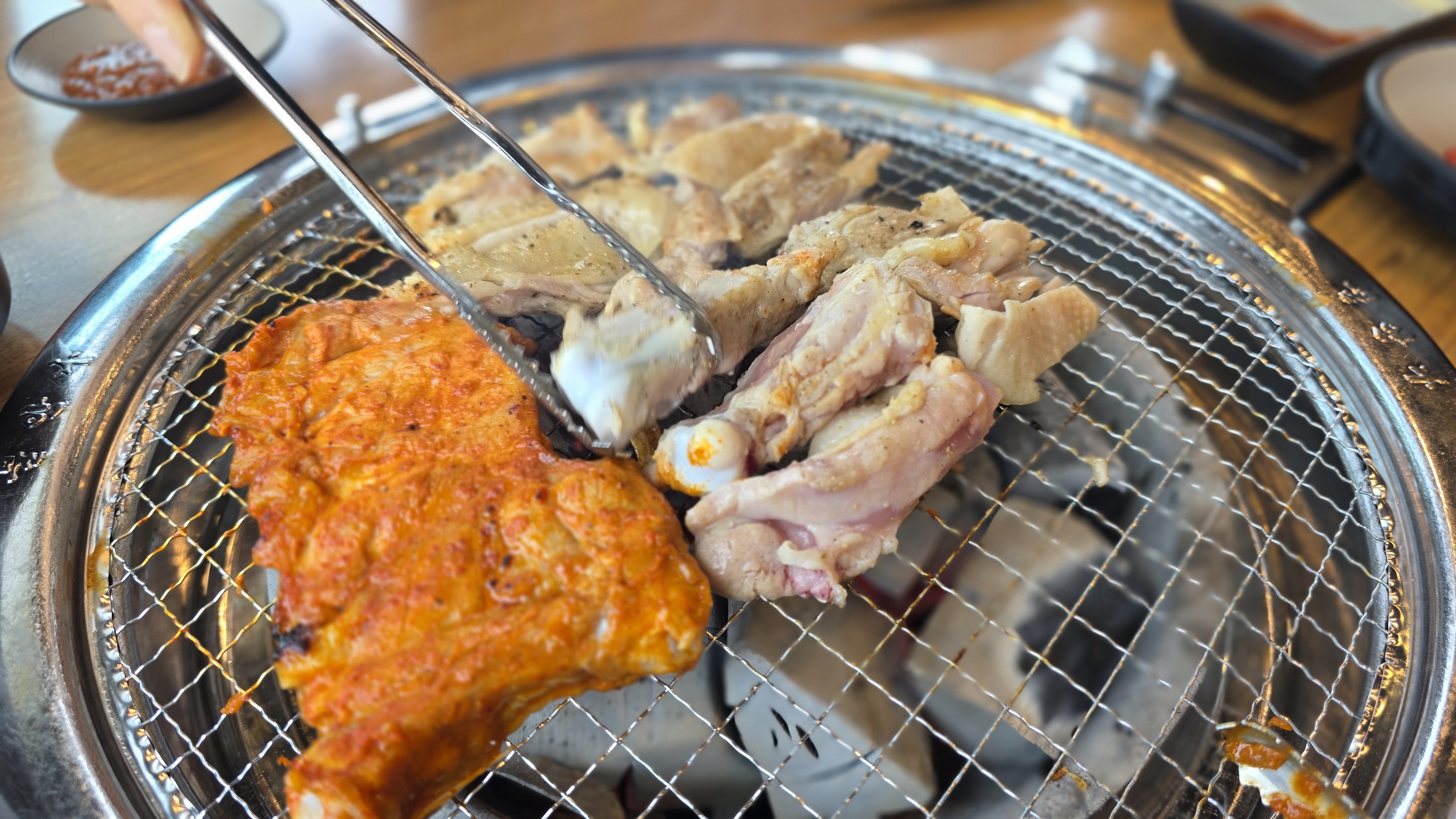 숯불에 굽는 방식이라 10초단위로 뒤집어 주라는 직원분의 언급에 고기를 자주자주 뒤집어 주어야 덜 탑니다. 특히 양념닭갈비는 딴 생각하면 양념이 타버리니 구울때는 잘 봐야 합니다.