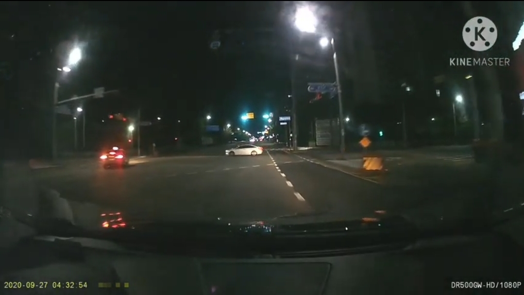 그런데, 사거리 우측편에서 흰색 차량이 갑자기 진입을 합니다. 새벽 시간이라 신호위반해서 지나가다보나하며 빠져나가겠거니 생각하고, 브레이크에 발을 올리고 탄력주행으로 달리는데, 흰색 차량이 갑자기 사거리 중간에 서 버립니다. 아마도 좌측에서 앞서 달리는 택시가 좌회전을 할려는 걸 보고 그대로 직진하면 사고가 날 것이라 생각해서 서 버린 듯 한데요.