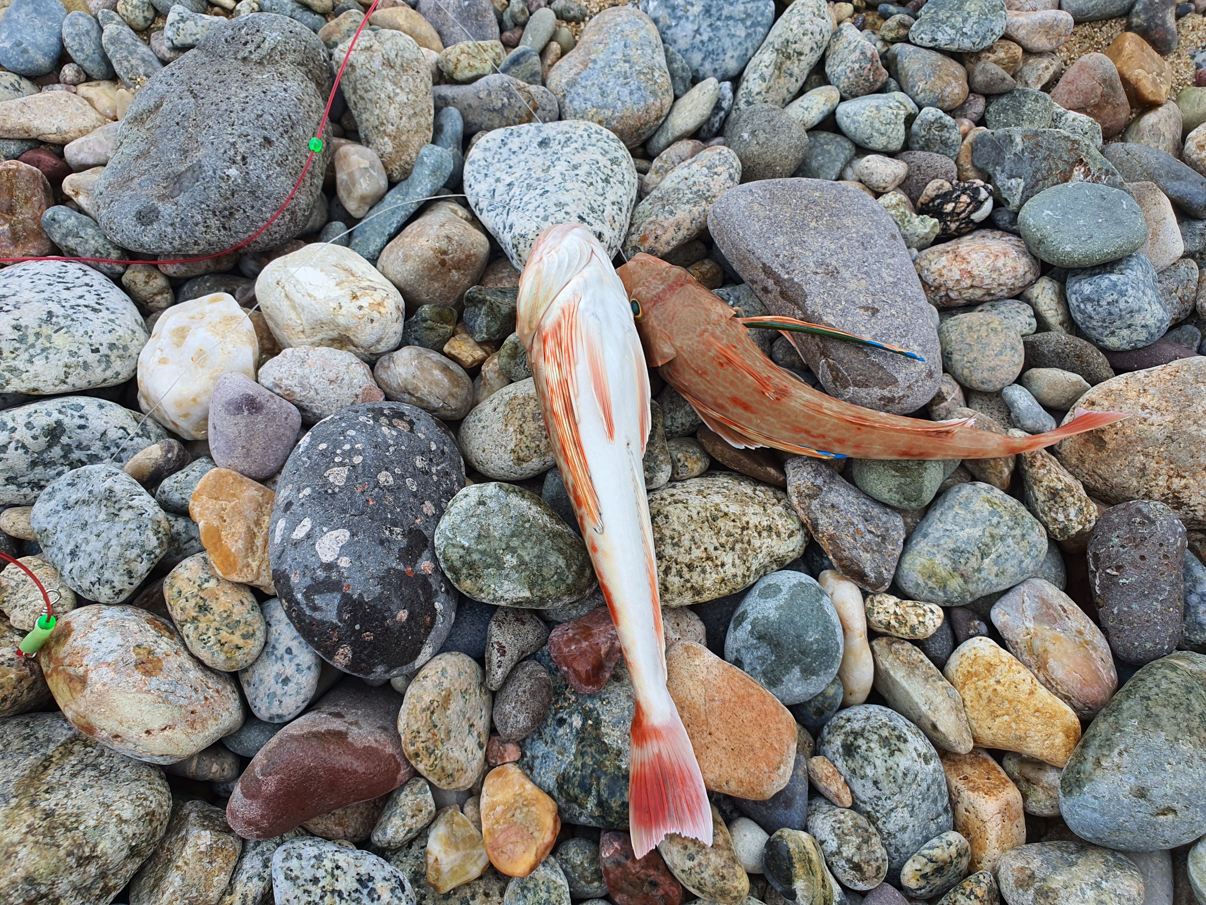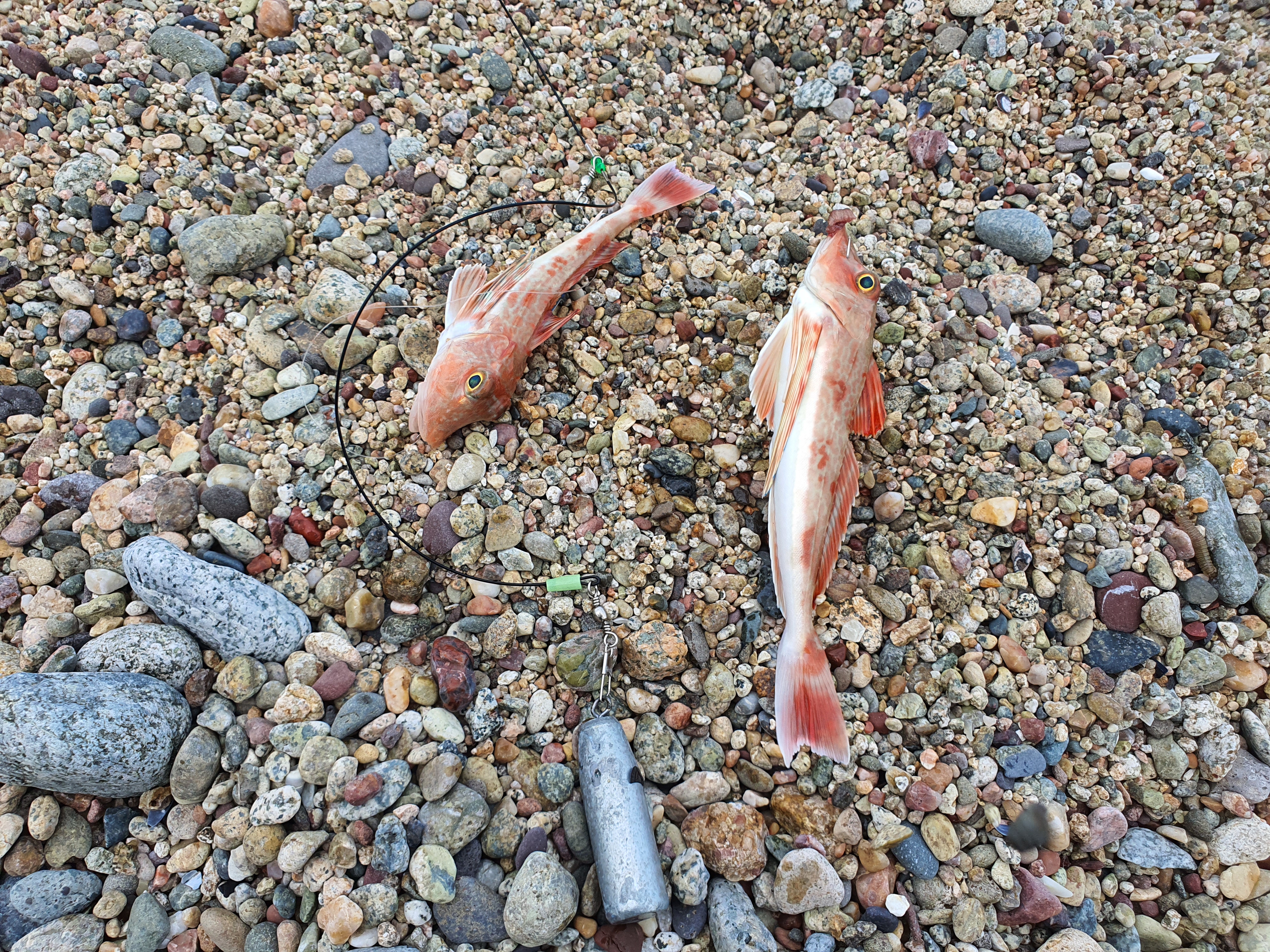 미끼도 염장지렁이로 같은걸 쓰는데 뭐가 다를까 생각하던 중에 입질이 옵니다. 톡톡치기도 하고, 쭈욱 잡아당기기도 하는 입질에 올리니 성대가 쌍걸이로 올라오네요.