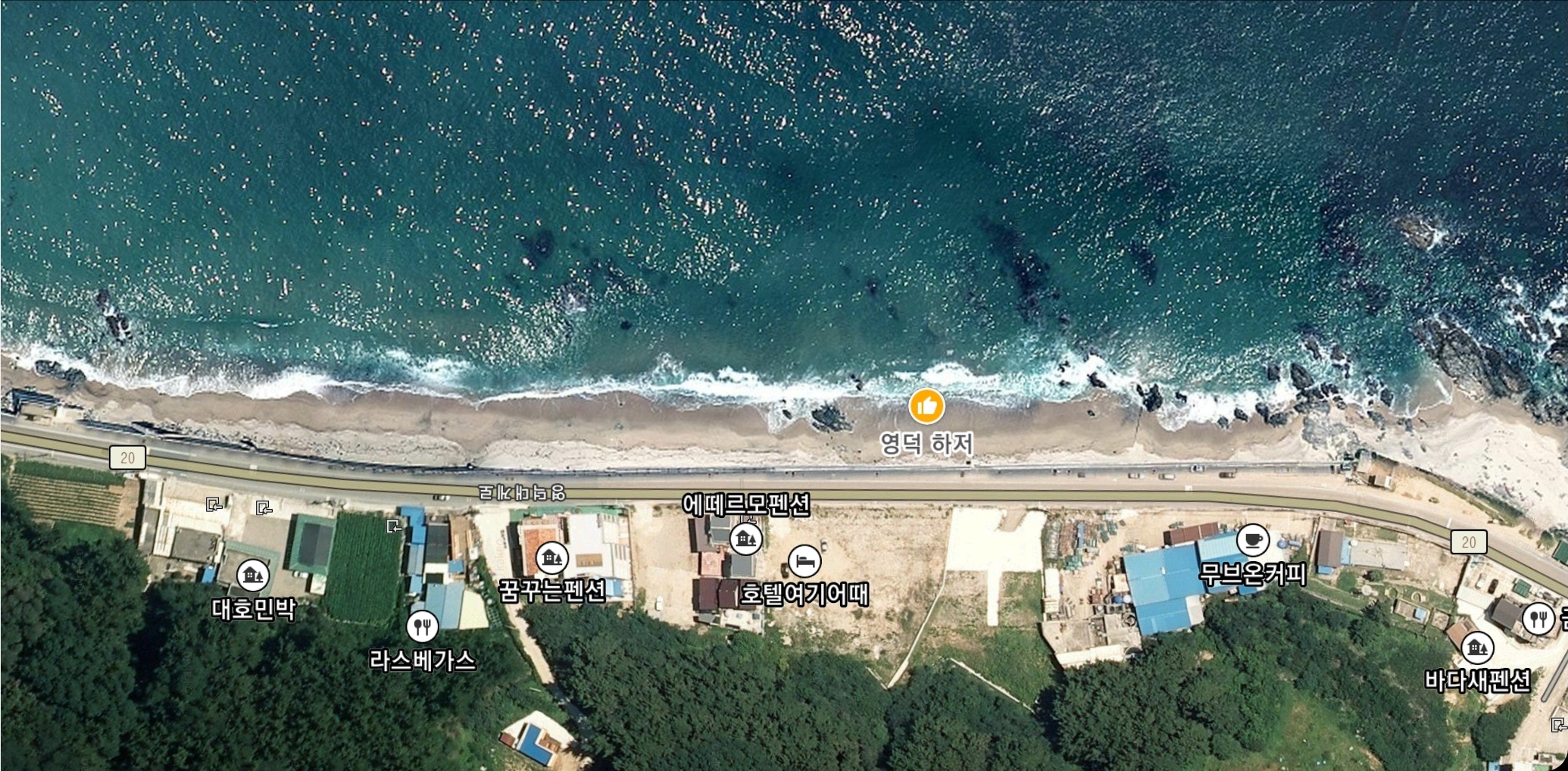 이번에 출조한 포인트는 영덕 강구항에서 차로 5~7분 거리에 있는 하저해변입니다. 대부분은 모래이지만 중간 중간 자갈밭이 형성되어 있고, 우측에는 여밭이 일부 확인되는 포인트입니다. 지금 시즌에는 성대가 주로 올라오며, 가끔 여밭 주변에서 놀래미가 올라오는 듯 합니다.