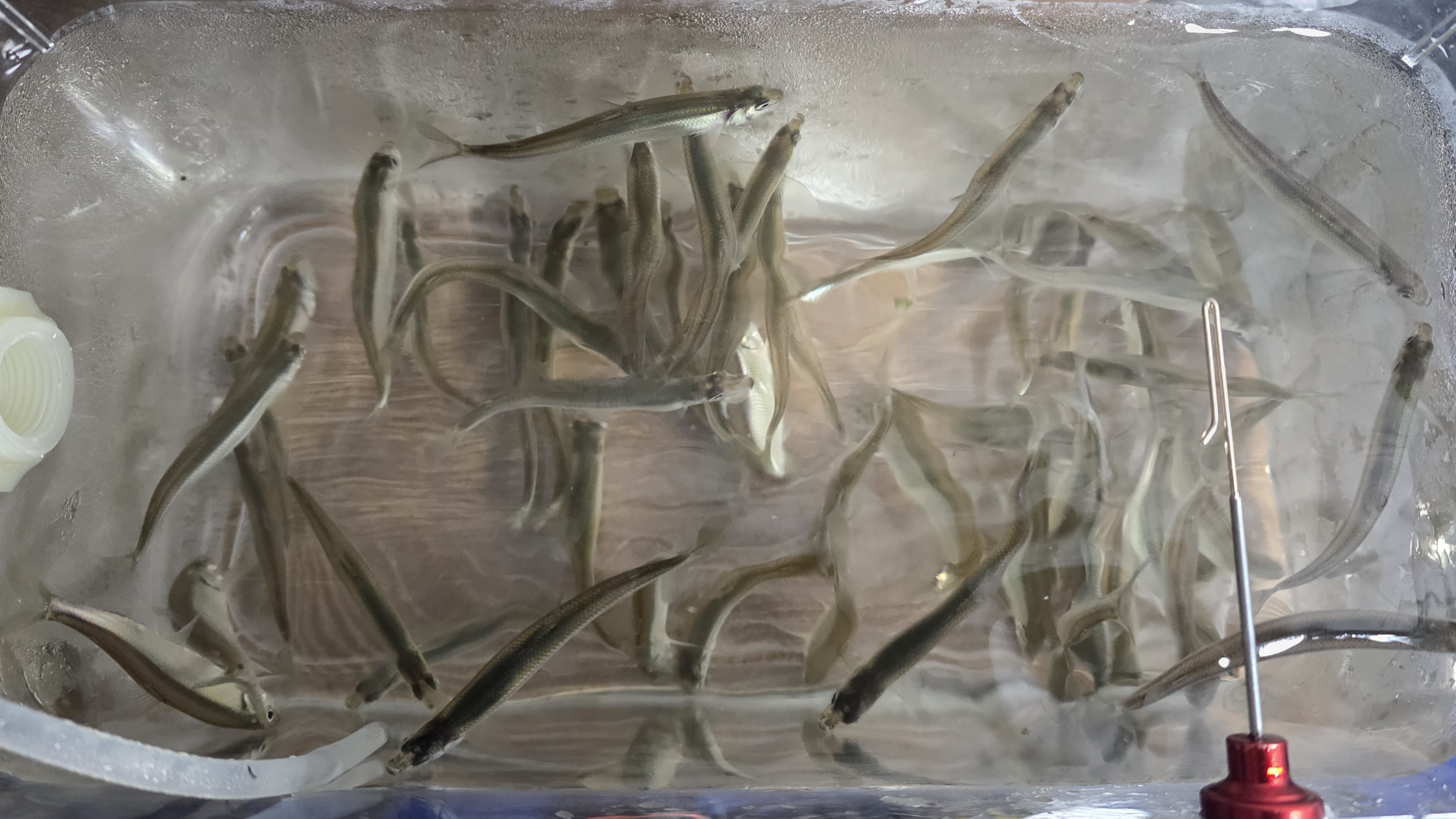 덕이를 끼우고 채비를 내리니 입질은 하지만 물지를 않더군요. 다행히 수조에 물을 채우기 시작하니 25-26 시즌 귀운지 첫 빙어가 올라옵니다.
