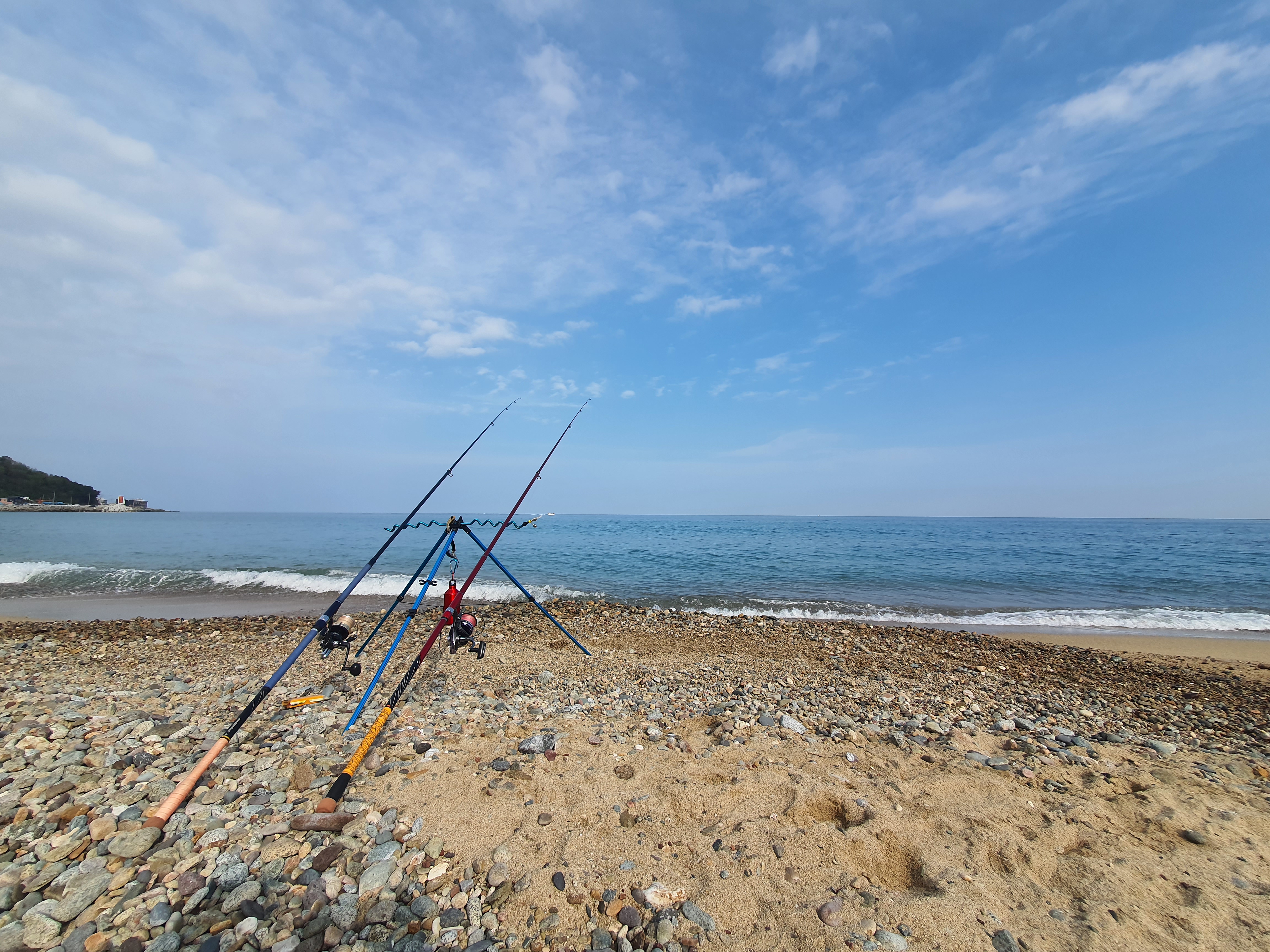 이번에 출조한 포인트는 영덕 강구항에서 차로 5~7분 거리에 있는 하저해변입니다. 대부분은 모래이지만 중간 중간 자갈밭이 형성되어 있고, 우측에는 여밭이 일부 확인되는 포인트입니다. 지금 시즌에는 성대가 주로 올라오며, 가끔 여밭 주변에서 놀래미가 올라오는 듯 합니다.