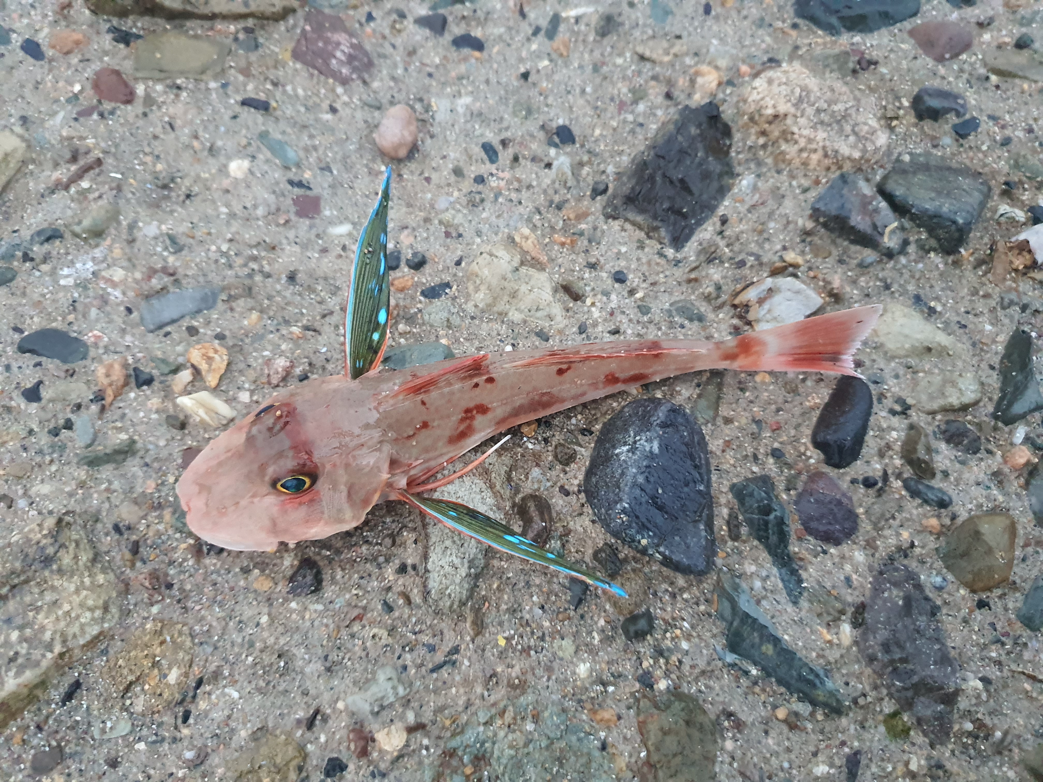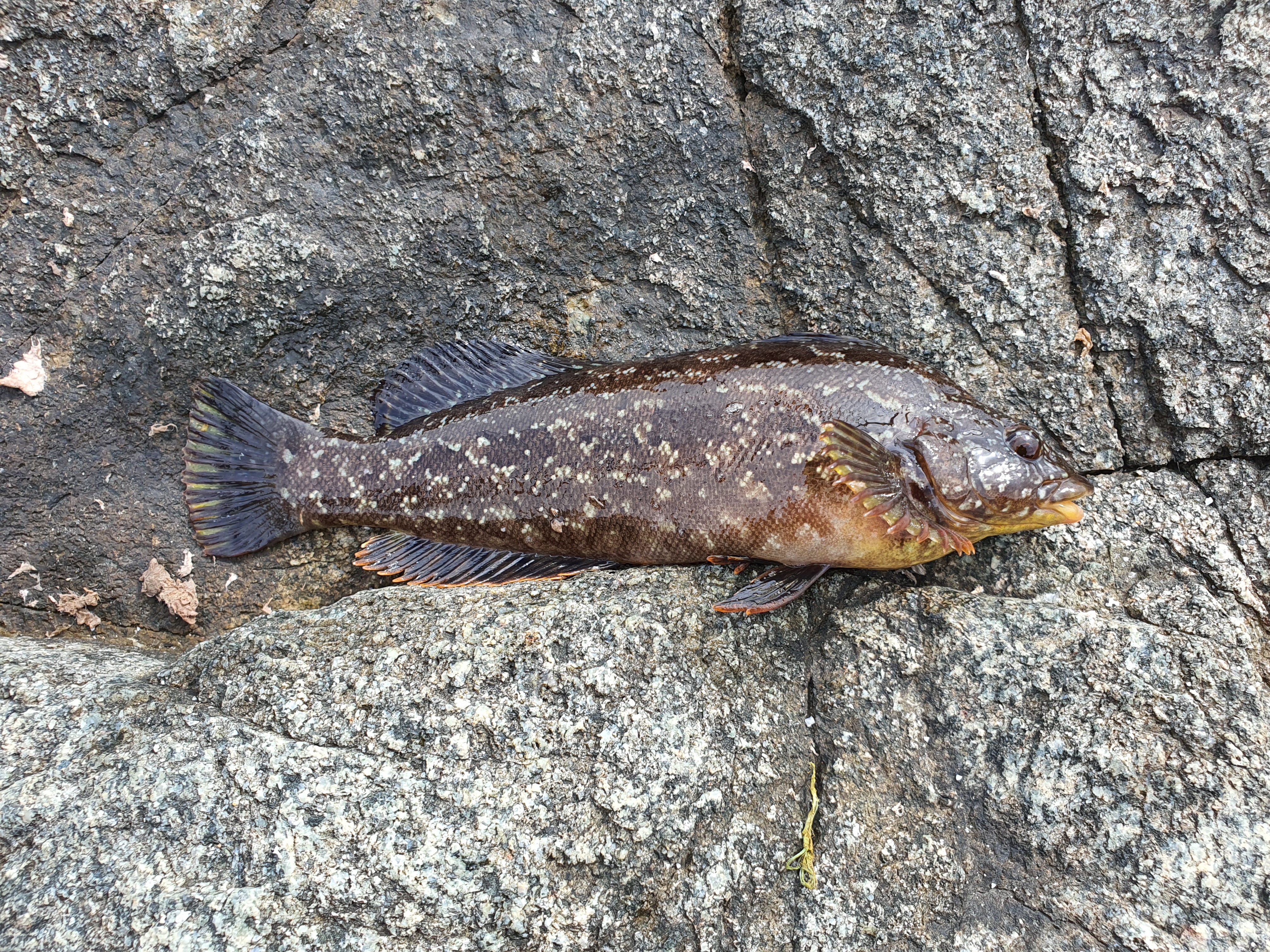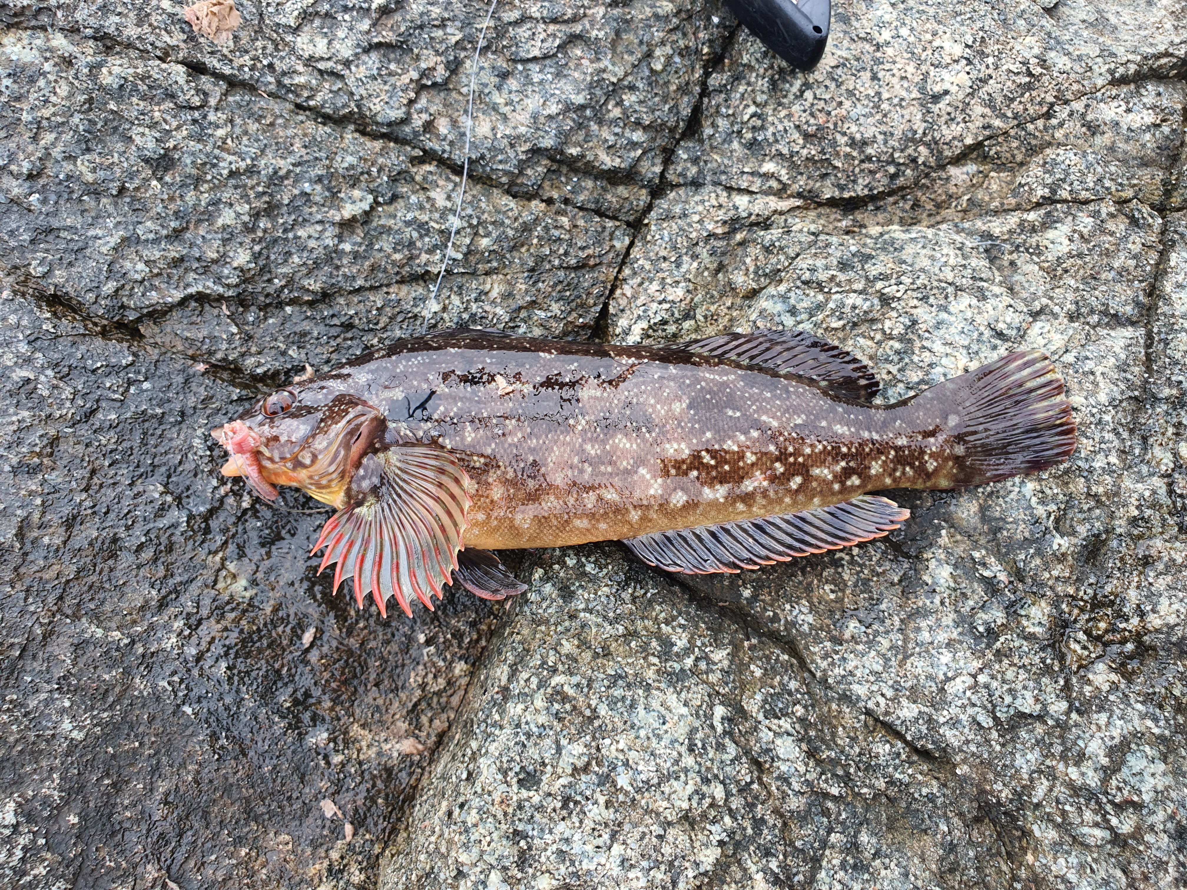 첫 캐스팅에서 바로 입질이 오고 역시나 성대가 올라오네요. 사이즈는 어제 하저해변에서 잡은 성대와 크게 다르지 않습니다.