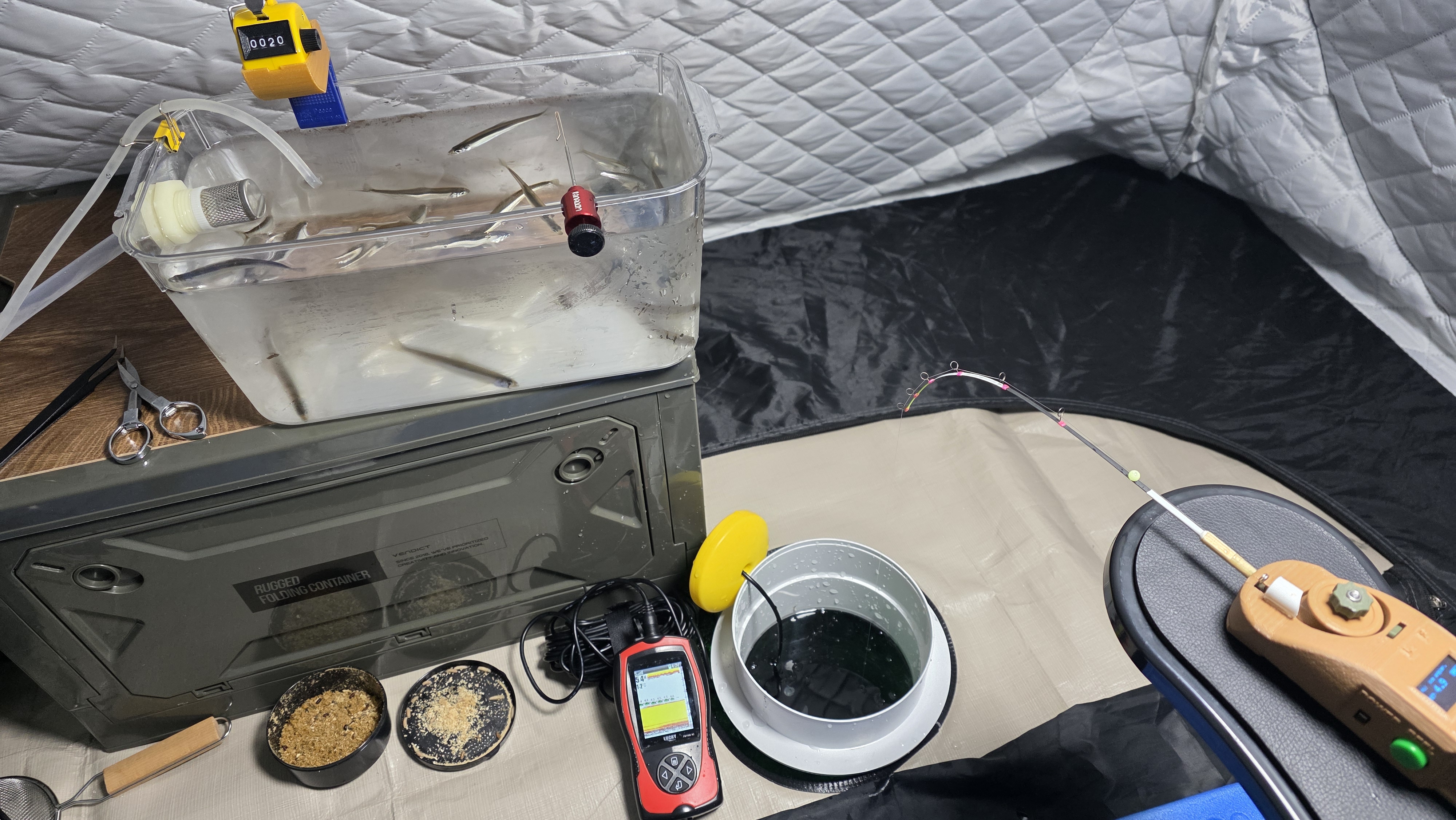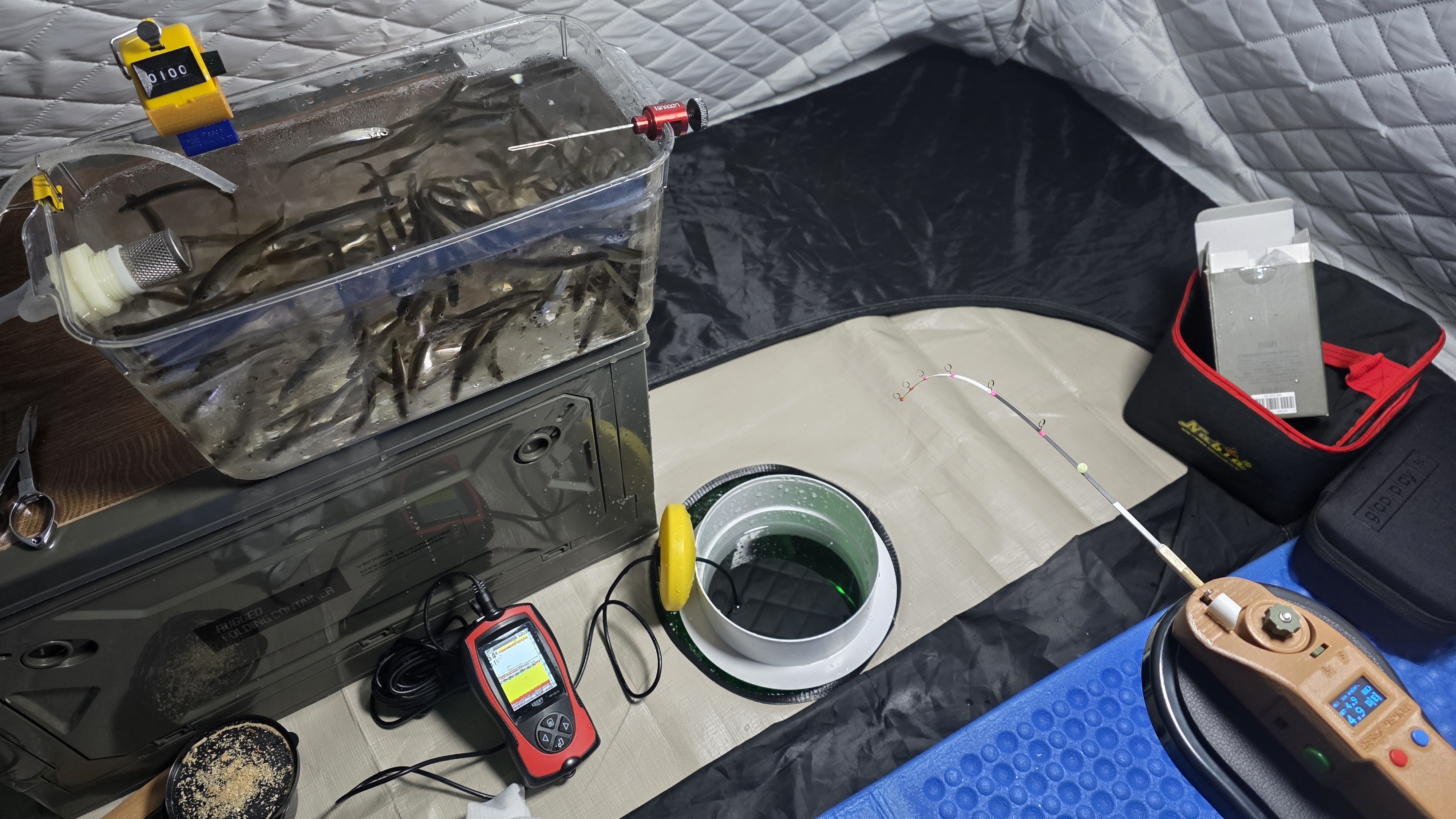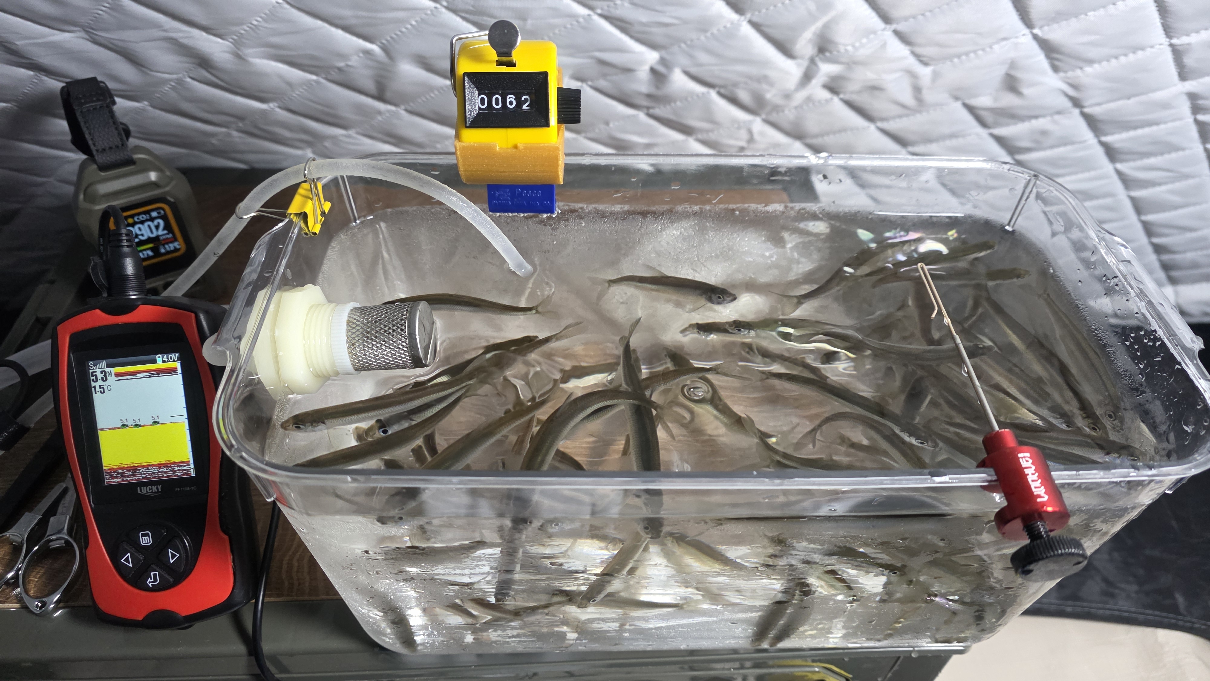 그런데 세팅을 마무리하고 어탐기를 켰는데 어군이 없네요. 자리를 옮겨야할지 고민하다가 일단 해 보기로 합니다.