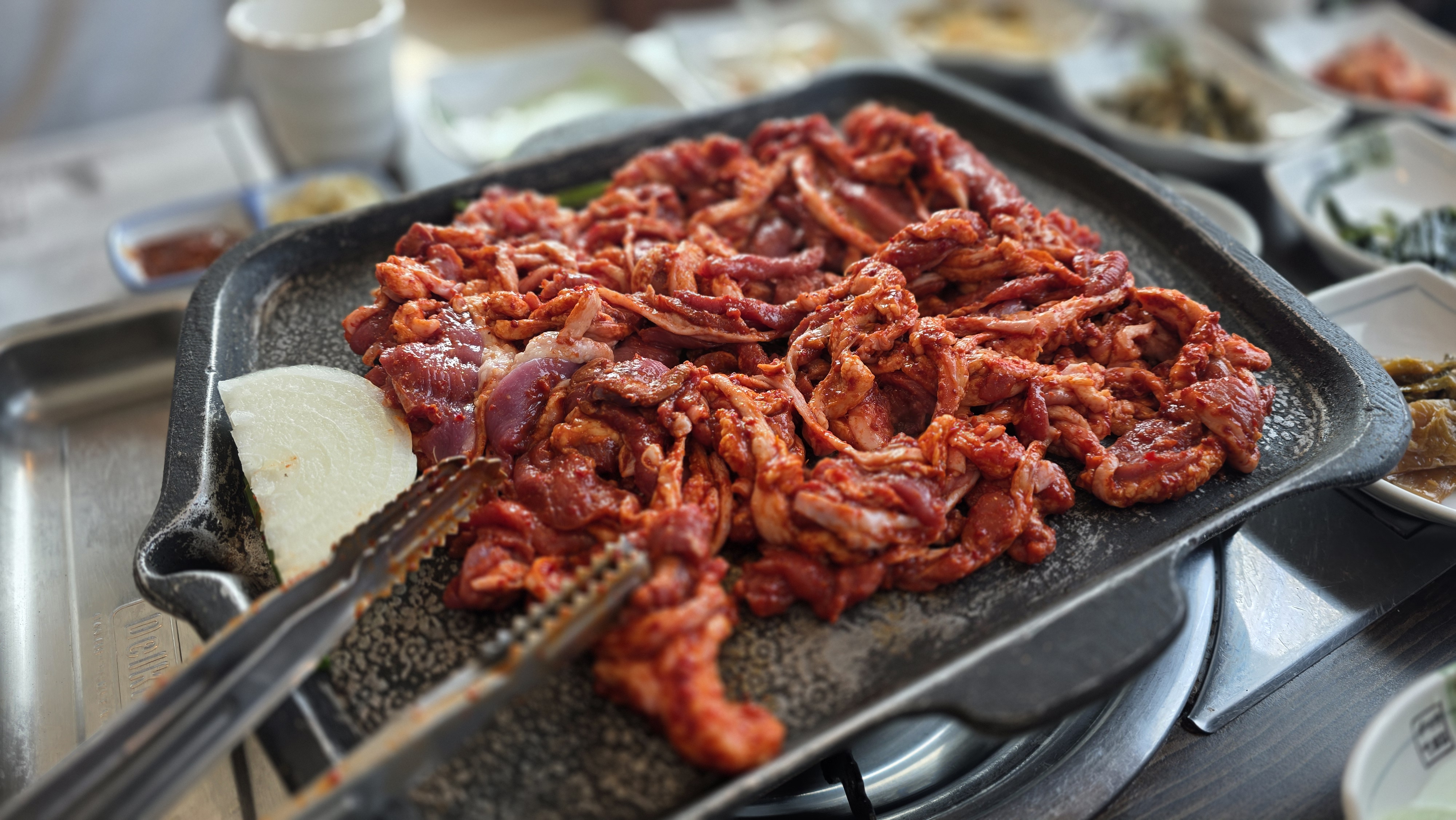기본반찬으로 얼갈이 무침에 고추, 양파 장아찌에