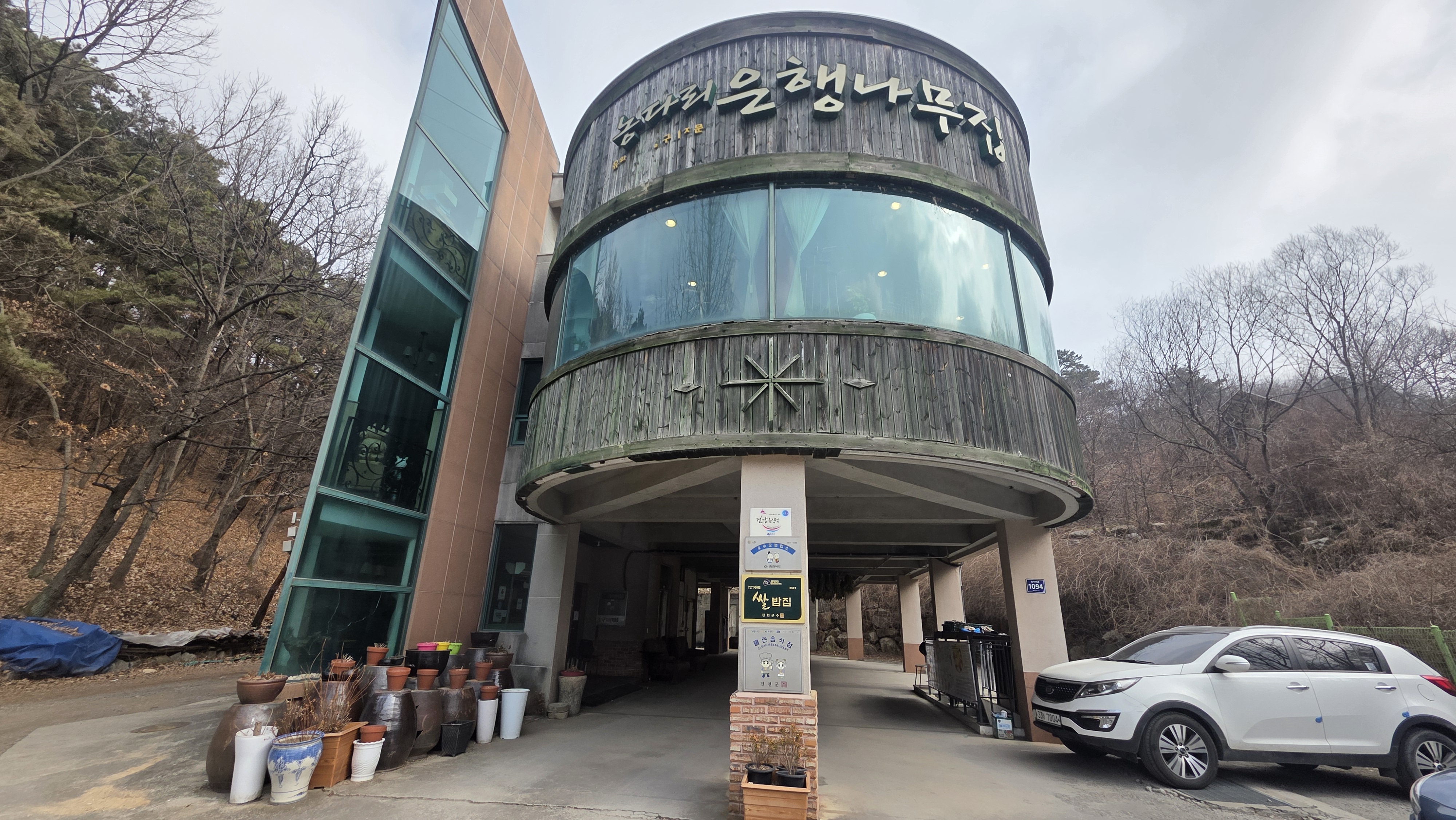 진천 농다리에서 차로 3분 거리로 아주 가까운 곳에 위치한 농다리 은행나무집은 지상은 주차장이고, 2층에 식당이더군요.