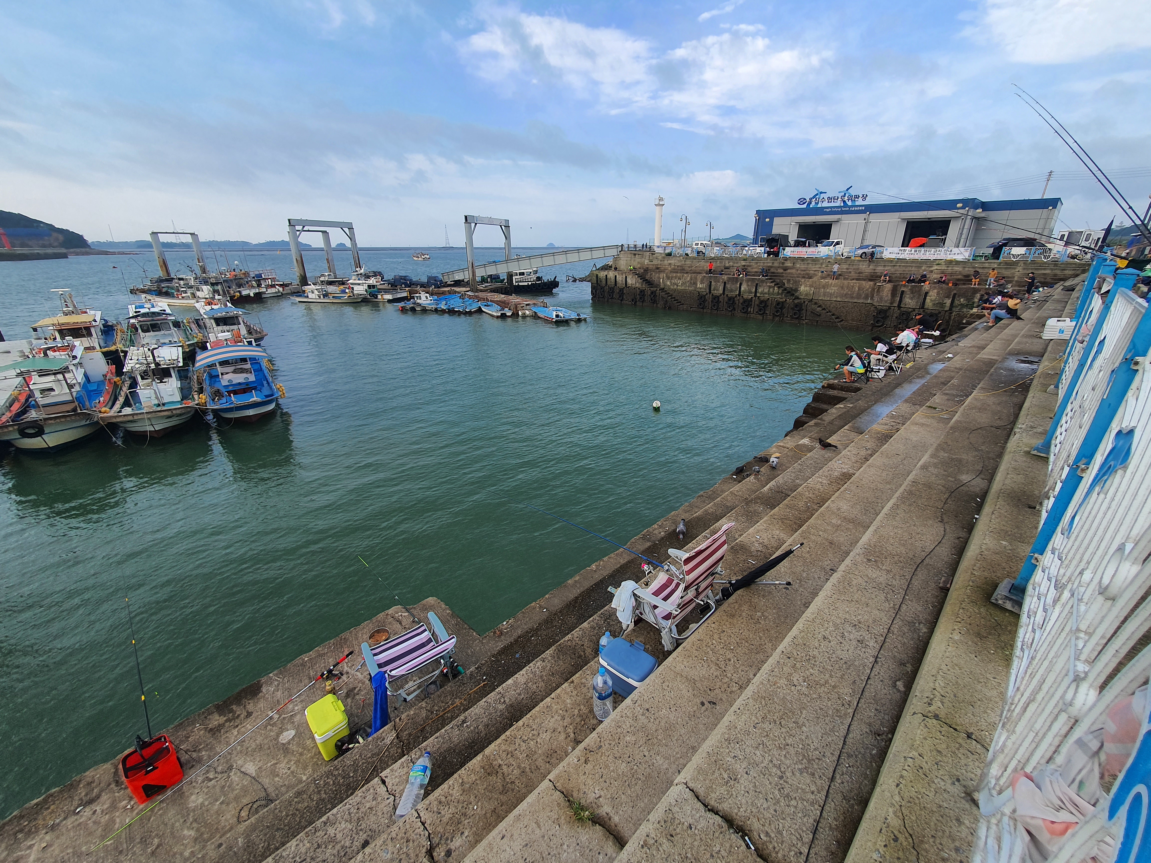 탄도항 내항 포인트입니다. 계단식 콘트리트 발판이라 많은 분들이 생활낚시를 즐기고 있습니다. 주로 가을에는 전갱이를 잡고, 잡은 전갱이를 미끼로 삼아 삼치를 노리더군요. 그리고, 전어를 잡기도 합니다.