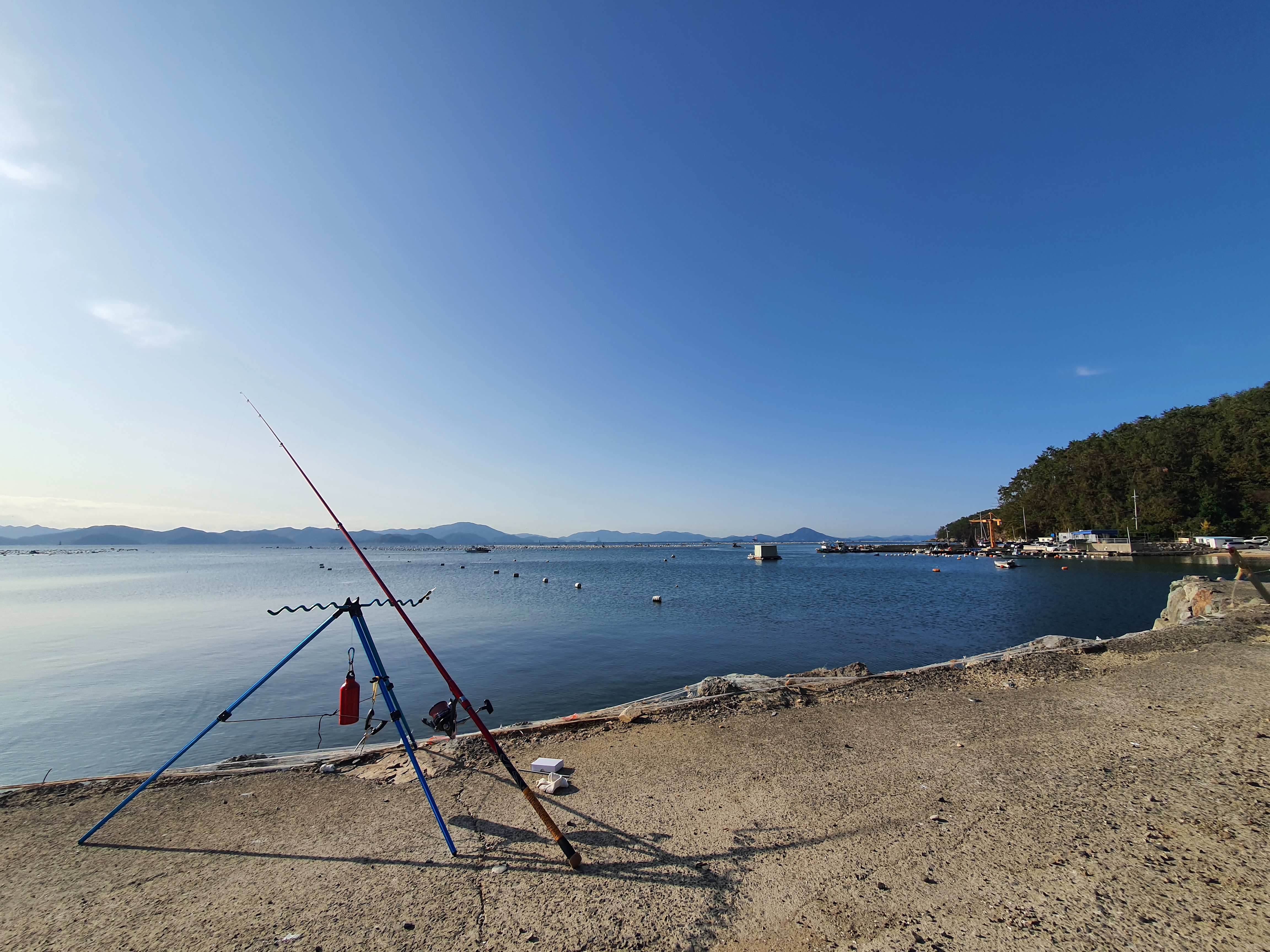바다에는 양식장이 엄청 많고, 그리 멀지 않는 곳에 부표를 띄어둔 그물이 많아 원투 낚시를 하기에는 그리 좋지 않아 보였습니다. 그마나 제일 좌측과 우측이 던질만한 포인트였지만 좌측은 해암사라는 절이 있어 들어가서 하기에는 애매하더군요. 그래서 우측으러 가보니 발판도 나쁘지 않아 우선 한대만 펴 봤습니다. 던지고 나서 입질은 오는데, 물지는 않더군요. 그리고, 회수를 하면 뭔가에 계속 걸리고, 바늘이 터져버립니다. 회수할때마다 걸리니 아니다 싶어 원래 계획한 원전항으로 포인트를 이동합니다.