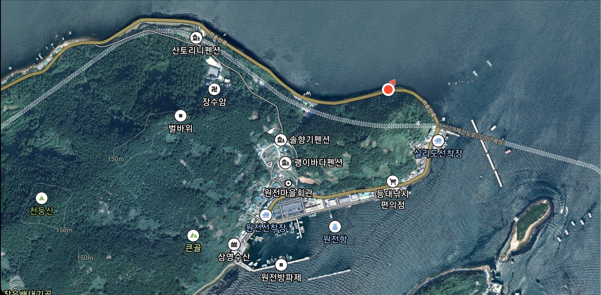 남해바다쪽으로 가기로 결정하고, 어느 포인트에서 할 것인가 고민을 엄청 했습니다. 거제도까지는 그래도 거리가 있어 지난번 출조했던 옥계방파제에서 더 내려간 원전항으로 가 보기로 하며 출발합니다. 그리고, 원전항 인근 낚시방에서 미끼를 구입하며 포인트 문의를 하니 심리별장쪽 바닷가가 나을거라는 귀뜸을 해 주셔서 일단 가보기로 합니다. 작은 마을이지만 숙박시설이 많아 차들이 많이 주차되어 있더군요. 방파제쪽은 작은데다가 이미 사람들이 자리 잡고 있고, 원투낚시를 할만한 포인트가 아닙니다.