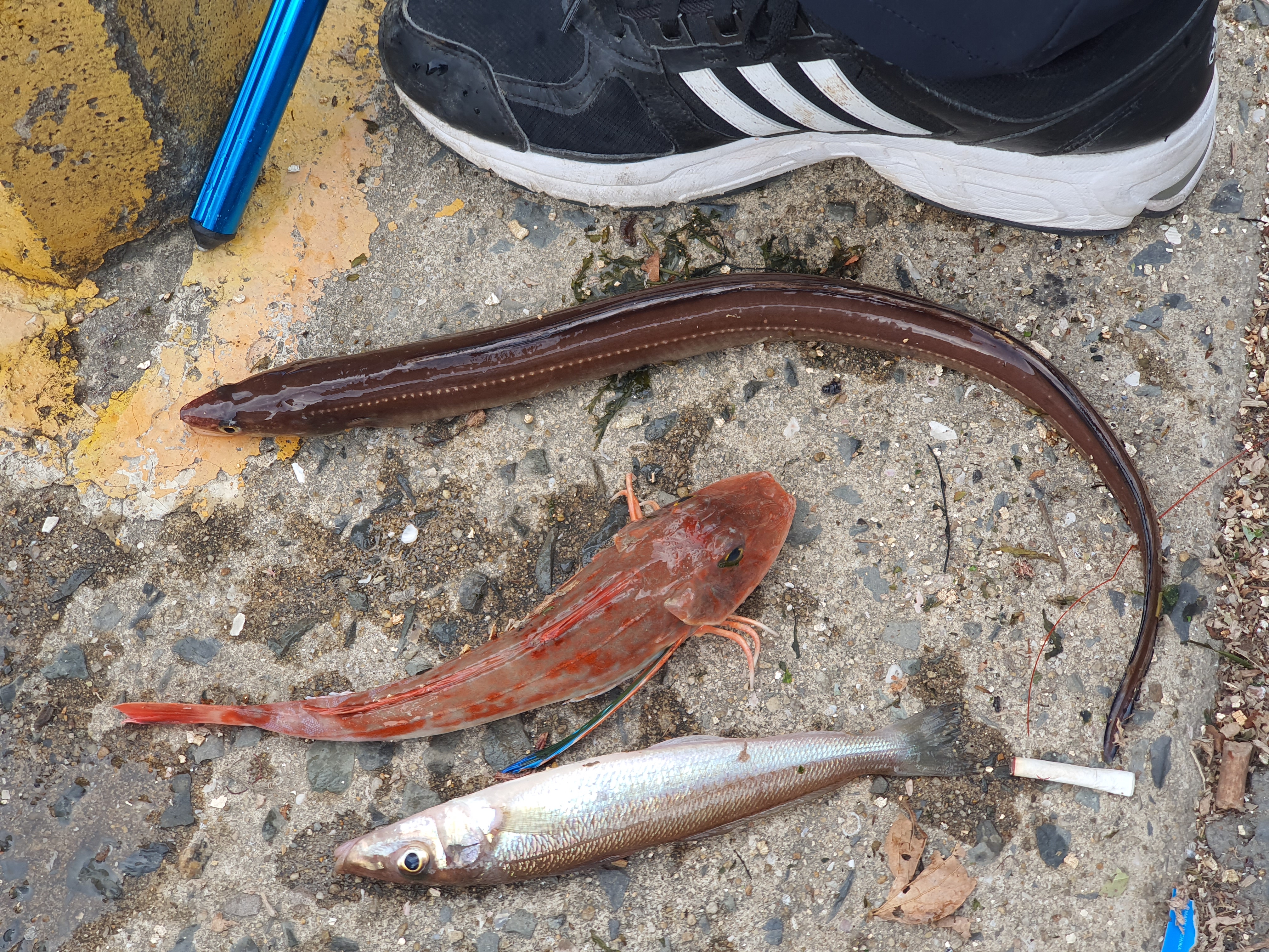 그리고, 다른 로드에서 연속 히트하며 2짜 수준의 큰 보리멸이 15호 바늘을 물고 올라옵니다. 채비를 다시 하고, 던지고 나서 얼마지 않아 또 다시 큰 입질로 초릿대가 휘청 거립니다. 또 다시 히트! 올리니 박카스급보다 살짝 작은 장어가 대낮에 올라오네요.