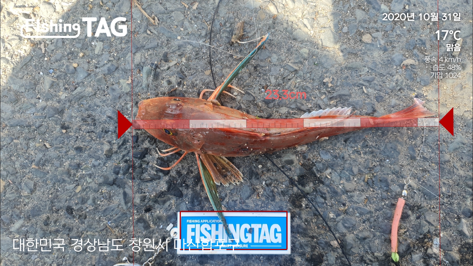 캐스팅을 하고 난 뒤, 얼마지 않아 입질이 강하게 옵니다. 간조타임이고 중날물때 정도 됩니다. 챔질 후 릴링을 하는데 힘을 쓰니 릴링도 버겁네요. 2짜 성대가 올라옵니다.