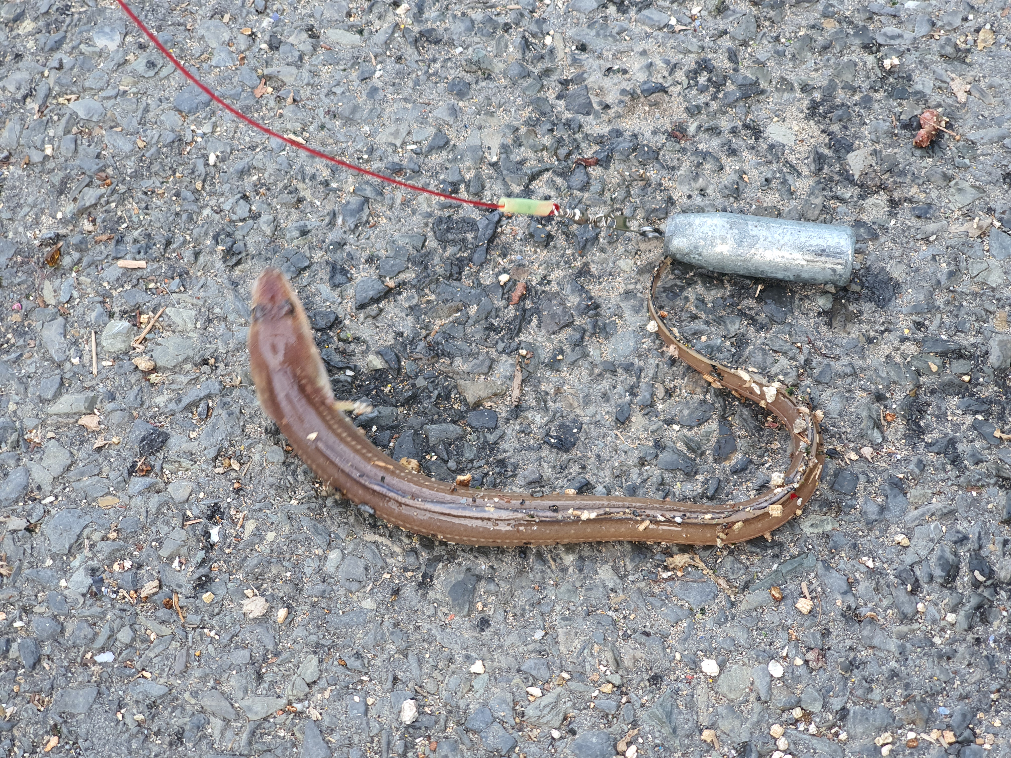 그리고, 다른 로드에서 연속 히트하며 2짜 수준의 큰 보리멸이 15호 바늘을 물고 올라옵니다. 채비를 다시 하고, 던지고 나서 얼마지 않아 또 다시 큰 입질로 초릿대가 휘청 거립니다. 또 다시 히트! 올리니 박카스급보다 살짝 작은 장어가 대낮에 올라오네요.