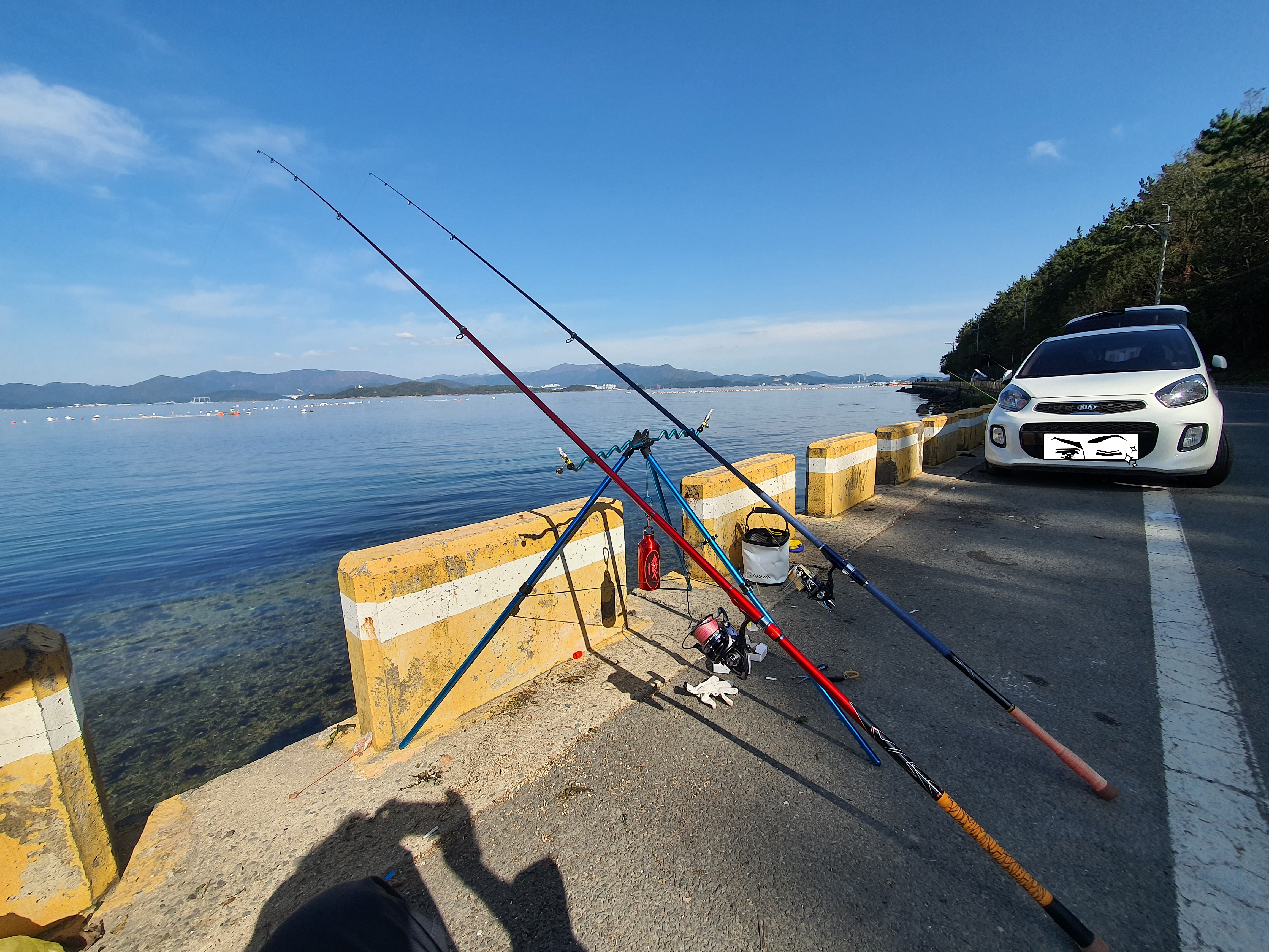 바다에는 양식장이 엄청 많고, 그리 멀지 않는 곳에 부표를 띄어둔 그물이 많아 원투 낚시를 하기에는 그리 좋지 않아 보였습니다. 그마나 제일 좌측과 우측이 던질만한 포인트였지만 좌측은 해암사라는 절이 있어 들어가서 하기에는 애매하더군요. 그래서 우측으러 가보니 발판도 나쁘지 않아 우선 한대만 펴 봤습니다. 던지고 나서 입질은 오는데, 물지는 않더군요. 그리고, 회수를 하면 뭔가에 계속 걸리고, 바늘이 터져버립니다. 회수할때마다 걸리니 아니다 싶어 원래 계획한 원전항으로 포인트를 이동합니다.