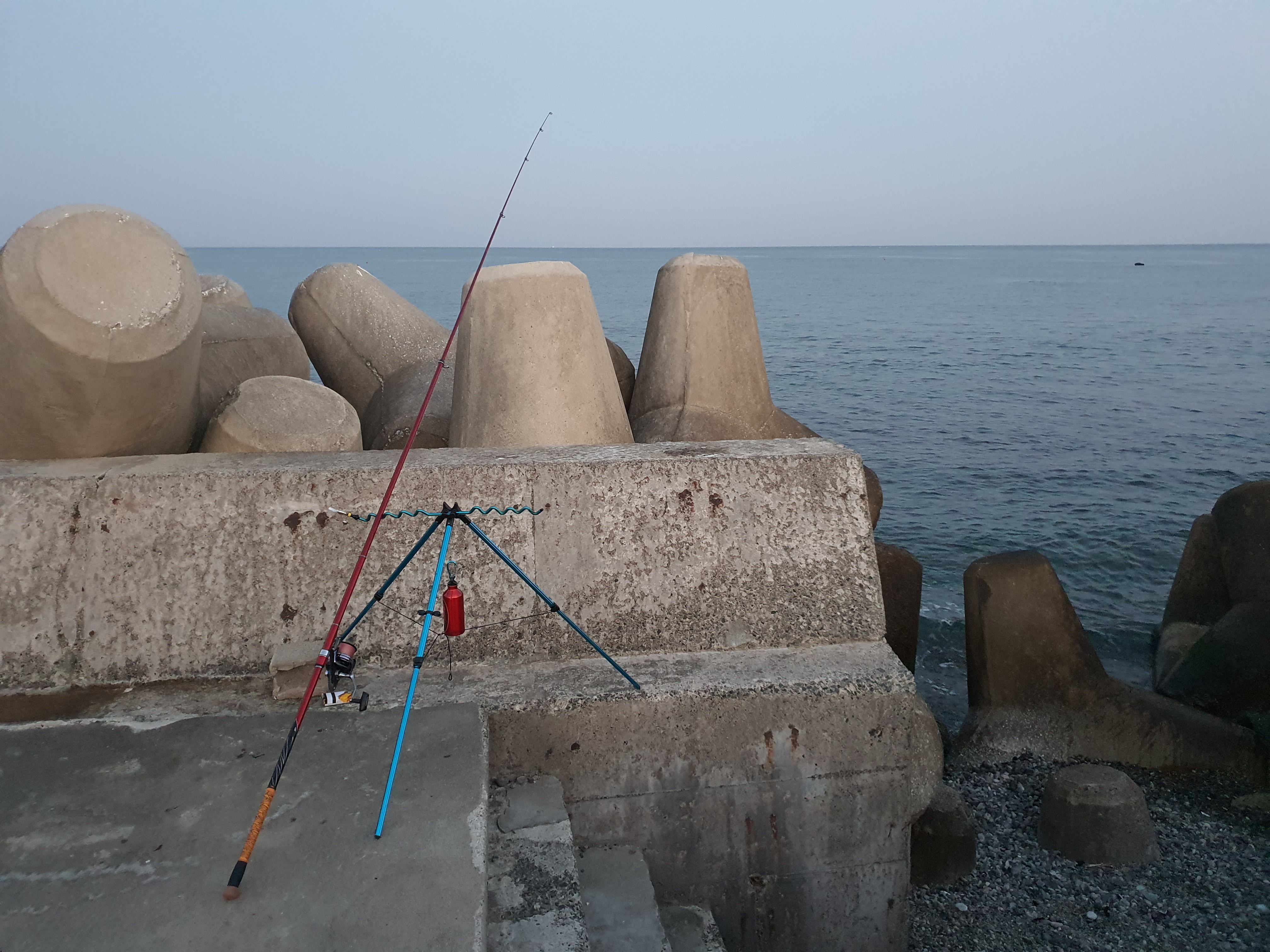 확 물어주지는 않았지만, 의외로 입질이 잦기도 해서 미끼도 추가로 구매하고, 다른 포인트 탐사도 해 볼겸 자리를 정리하고 다른 포인트 확인후 돌아왔지만, 원래 하던 포인트는 이미 다른 조사님들이 자리 잡고 있더군요. 그래서 좀 더 왼쪽의 테트라 사이의 공간이 있어 다시 자리를 잡습니다.
