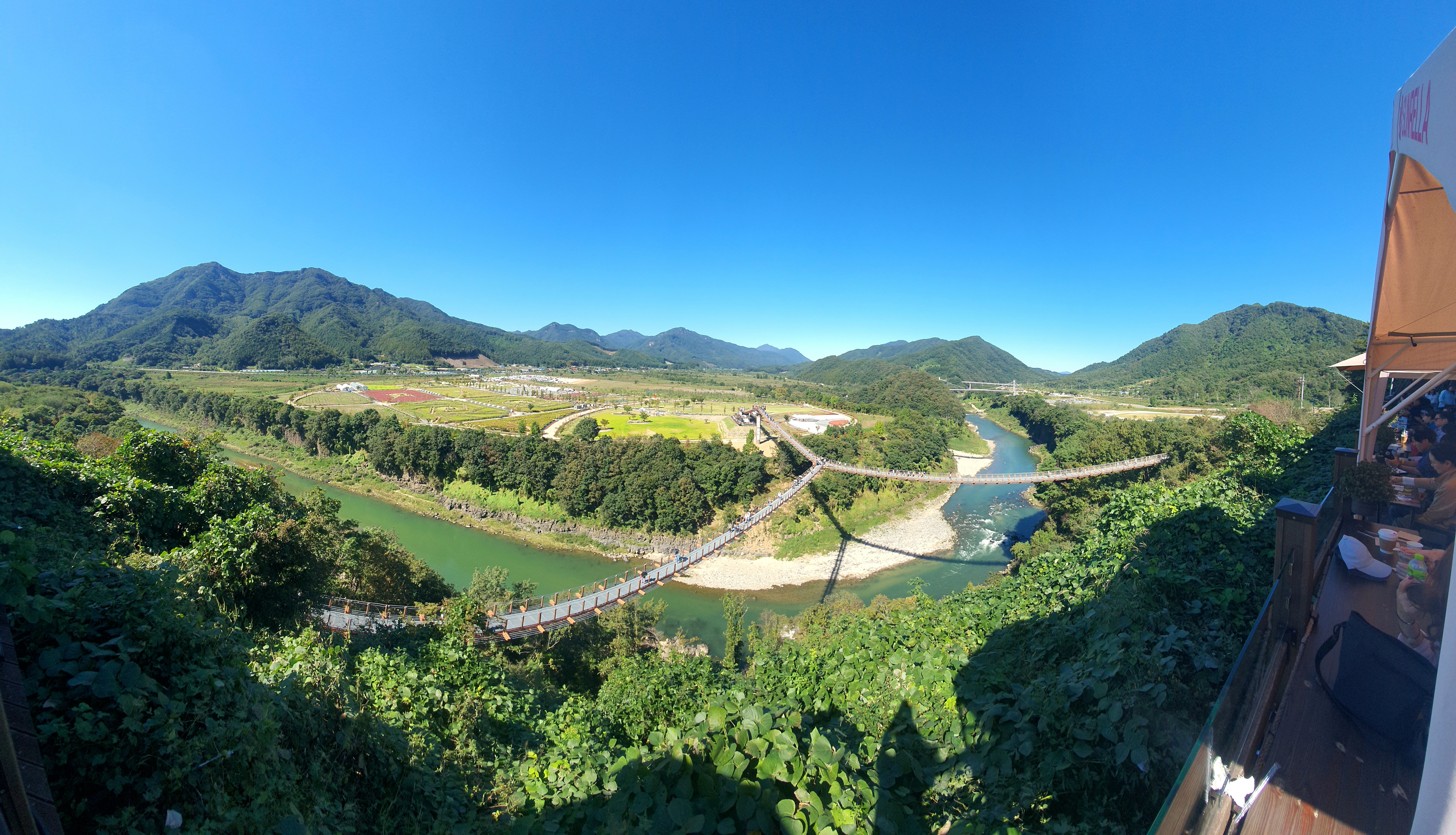 가람누리 카페에서 본 한탄강 및 Y자형 출렁다리와 생태경관단지입니다.