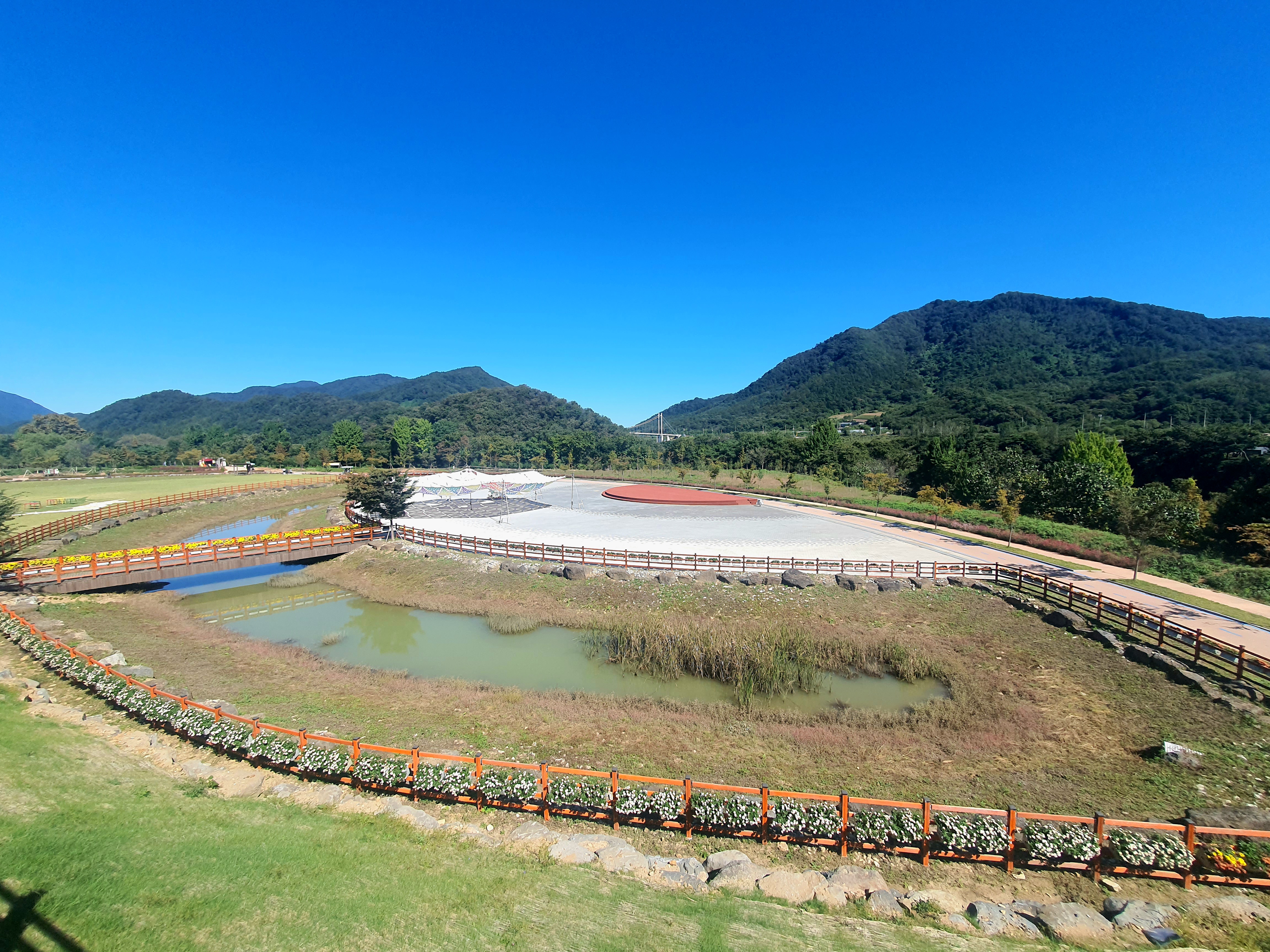 Y자형 출렁다리 오르는 곳 옆쪽으로 수면정원이 있는 메인무대가 보이네요.